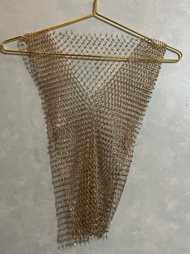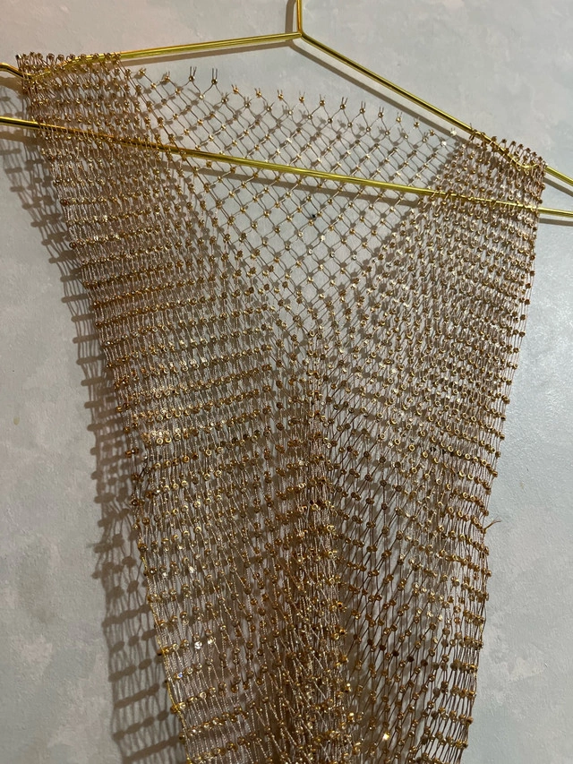 102Add a touch of sparkle to your wardrobe with this brand new vintage-inspired mesh top. Featuring a dazzling gold tone, this piece is perfect for layering or making a statement on its own. While I don't have specific measurements, this piece is quite versatile due to its open mesh design. If the ad is up, it's available! Pickup is in Brampton near Sheridan College