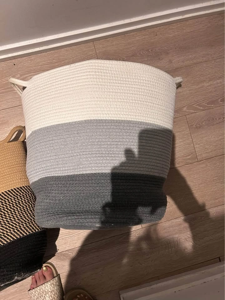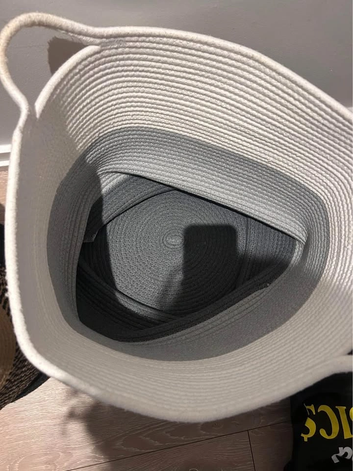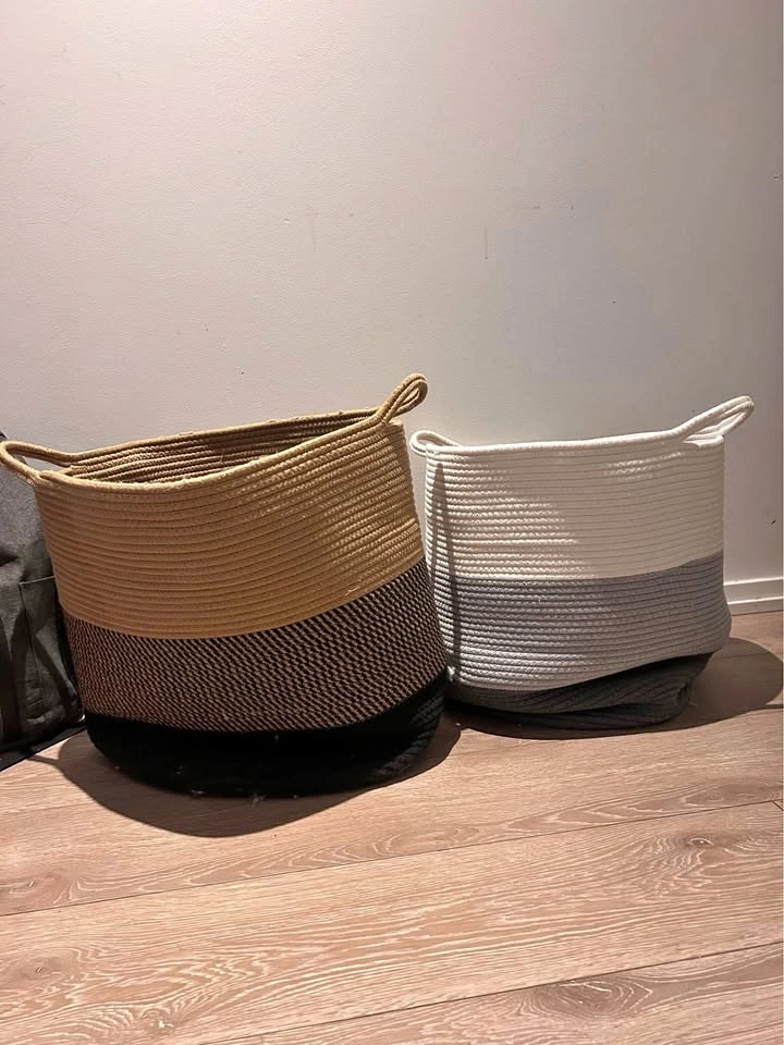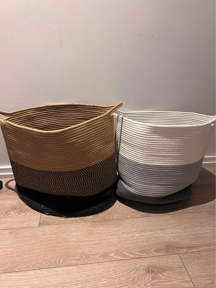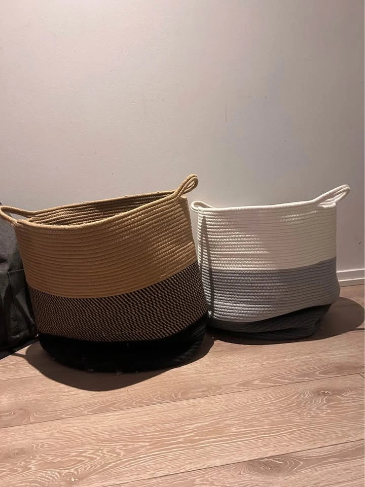 Selling a set of two rope storage baskets. One is a nice neutral tan, black and cream colour, and the other is white and grey. These are great for organizing toys, blankets, or laundry! They are in good condition and ready for a new home. Pick up 70 temperance street