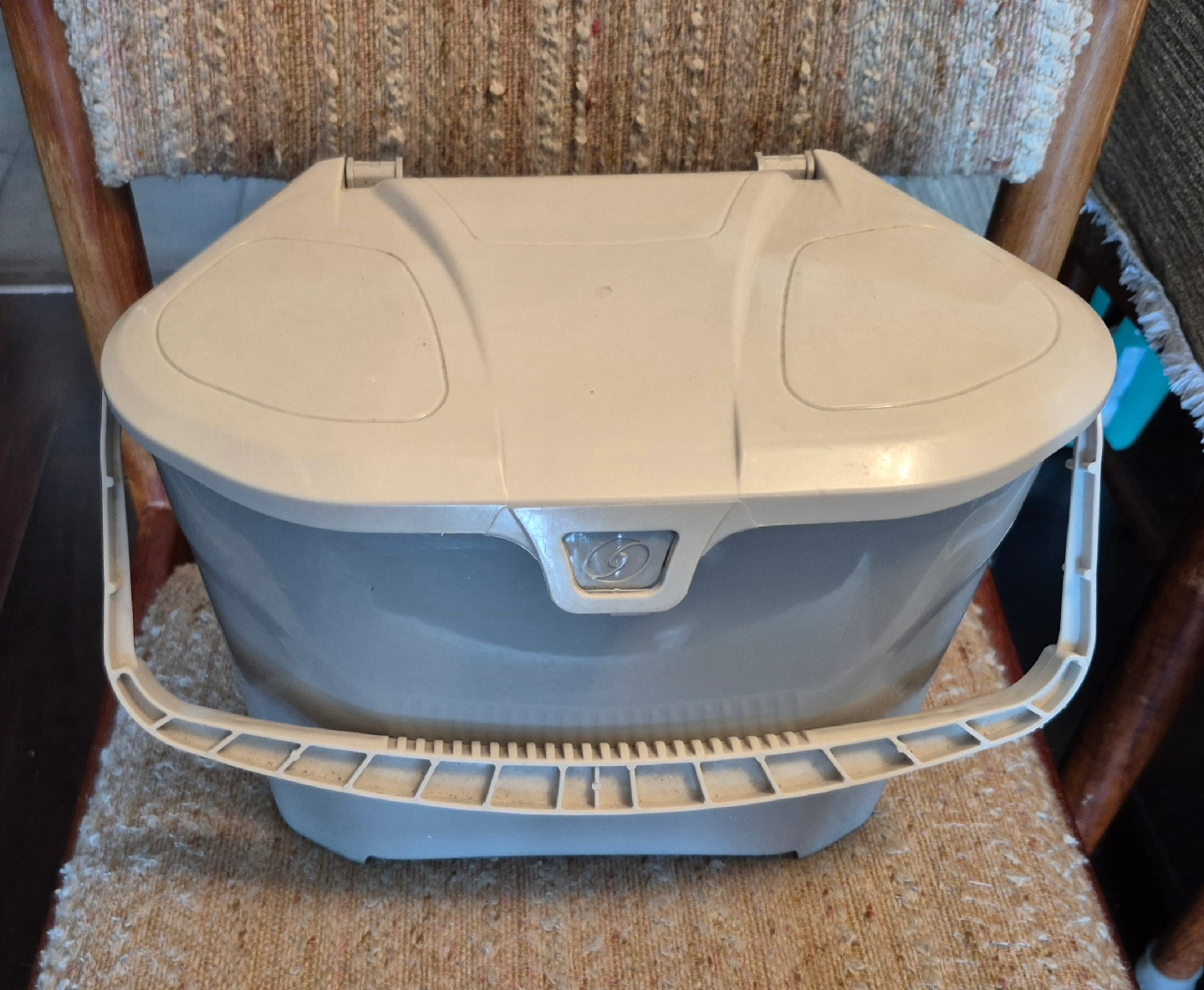 A grey plastic recycling container with a lid. NC. #2/2 items. I have multiple of these available for kitchen recycling needs. Pick up in PoCo.