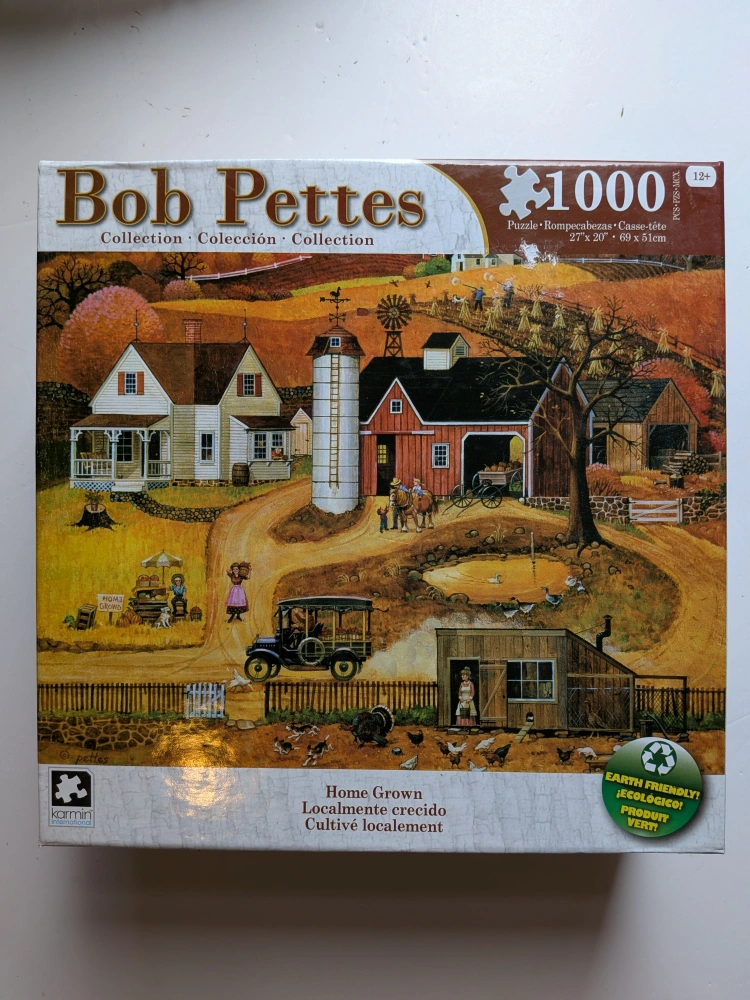 1000+Selling a Bob Pettes 'Home Grown' 1000-piece puzzle! It's from the Collection series. The puzzle dimensions are 27" x 20" (69 x 51cm). It's also earth friendly!