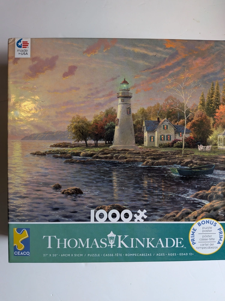 1000+Selling a Thomas Kinkade 1000 piece puzzle! The puzzle's dimensions are 27" x 20" (69cm x 51cm).