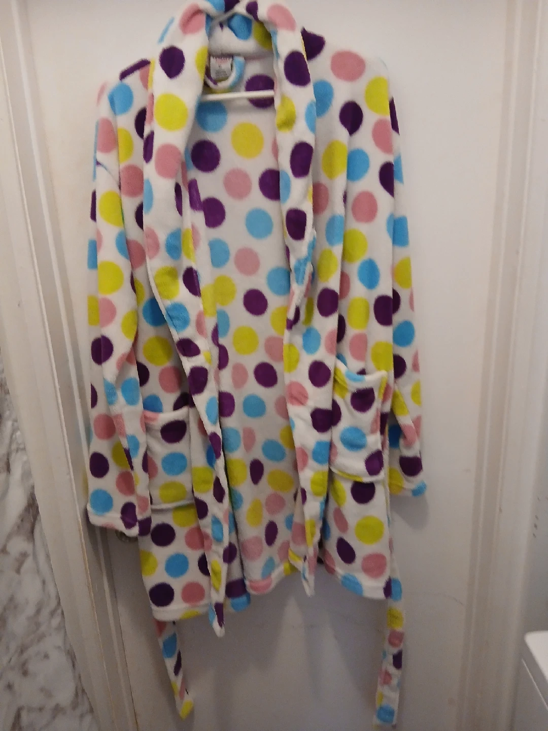 60Snuggle up in this fun polka dot robe! It's super soft and perfect for lounging around the house. The robe features a colourful design with yellow, blue, pink, and purple polka dots on a white background. It has a comfy tie waist and handy pockets too!