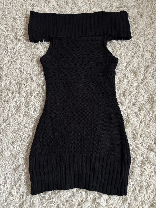 28Gorgeous sexy mini black dress by Guess Jeans. Off shoulder style. It is 100% cotton and in a ribbed texture. It is also lined. It has a mother of pearl button tag on the front bottom left. Size XS but can also fit a Small (it is stretchy. I’m a small/medium for reference) Please see the pictures for the measurements. In perfect condition. Was worn only once.