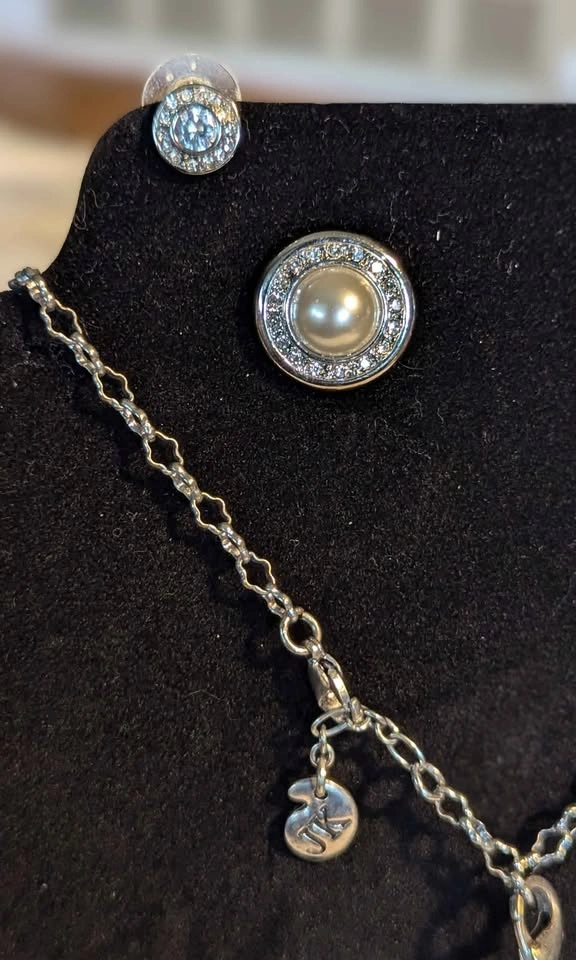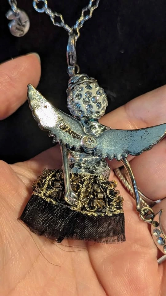 Beautiful, whimsical jewelry set featuring a collectible JK Angel pendant necklace and two pairs of coordinating earrings. Perfect as a gift or statement set for anyone who loves sparkle and symbolism. Details: Pendant: JK (signed).Jeweled angel with rhinestone wings, moon charm, and beaded skirt Chain: Long silver-tone link chain with JK charm, approx. 28" Earrings: (unmarked) Pair 1: Faux pearl with rhinestone halo (classic stud style) Pair 2: Smaller crystal solitaire studs (for layering or secondary piercing) All in excellent vintage-inspired condition, see photos for close up details. Feel free to message if you have any questions!