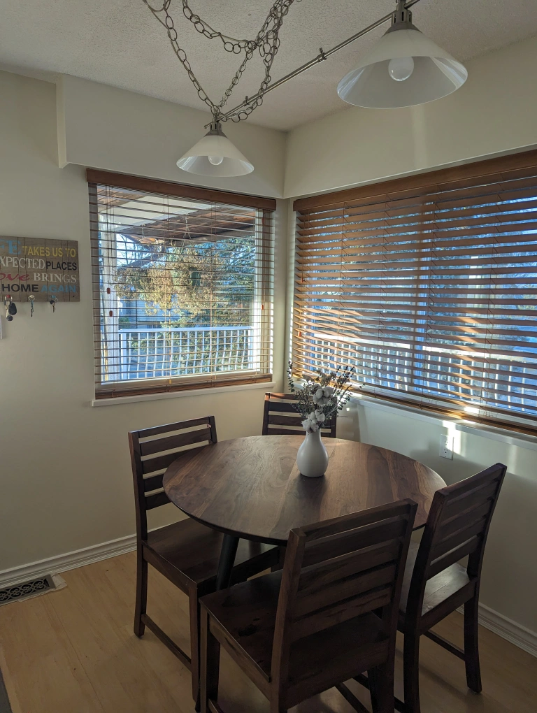 Selling our beautiful dining table with four matching chairs. The set is in excellent condition and has a beautiful wood grain finish. Perfect for a smaller dining area or kitchen nook. The table features a sturdy construction with a solid wood top and metal legs. The chairs are also made of solid wood and are very comfortable. A great set for family dinners or entertaining friends