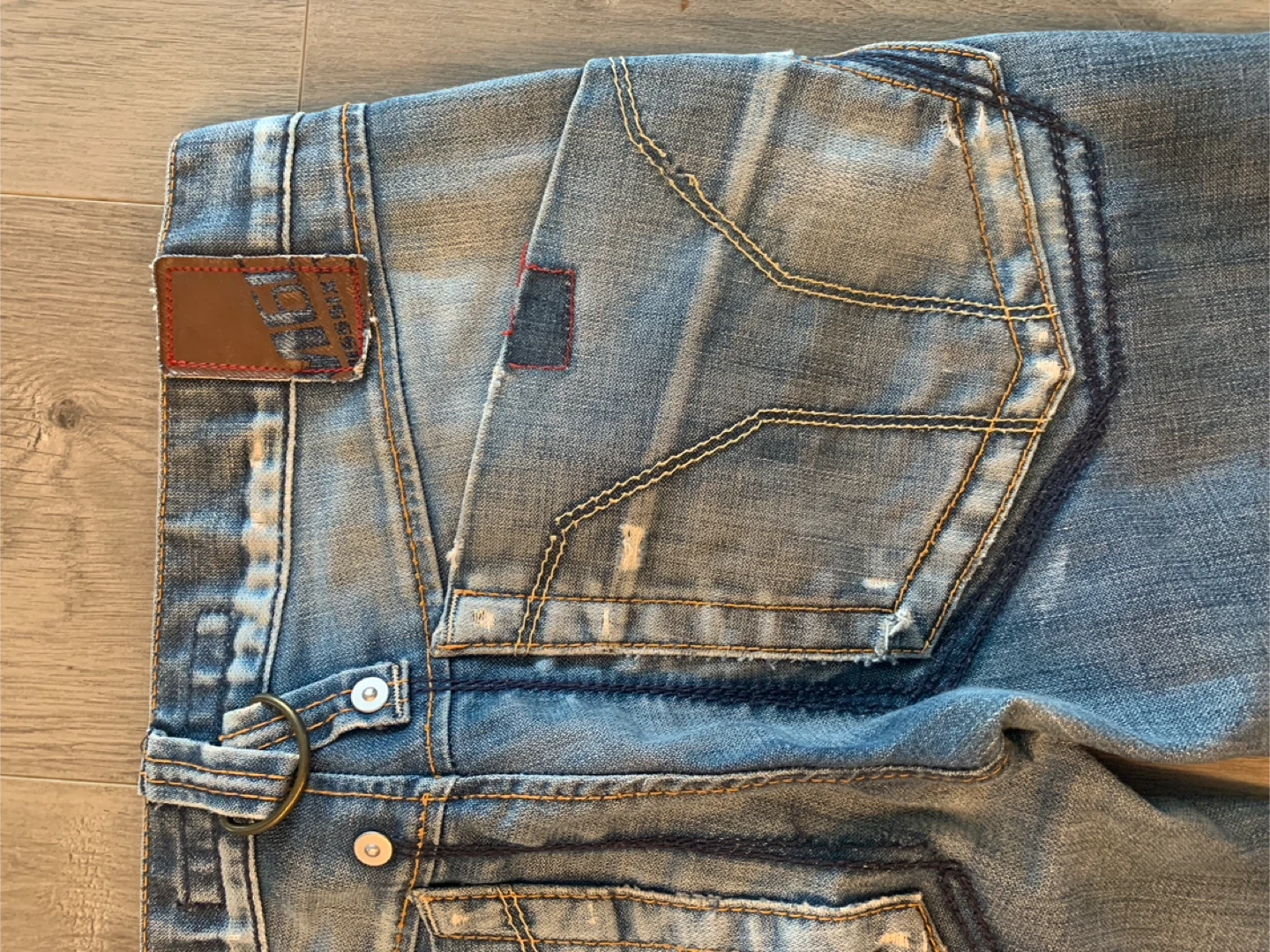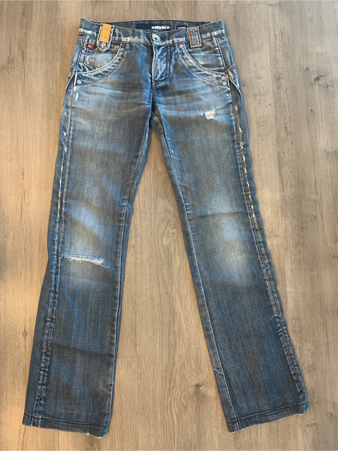 Selling a pair of Miss Sixty jeans, model 'Suprema'. They are a size 27 and made in Italy. The jeans have a distressed look with some fading and minor wear. Made of 100% cotton