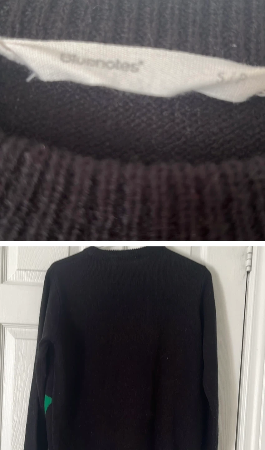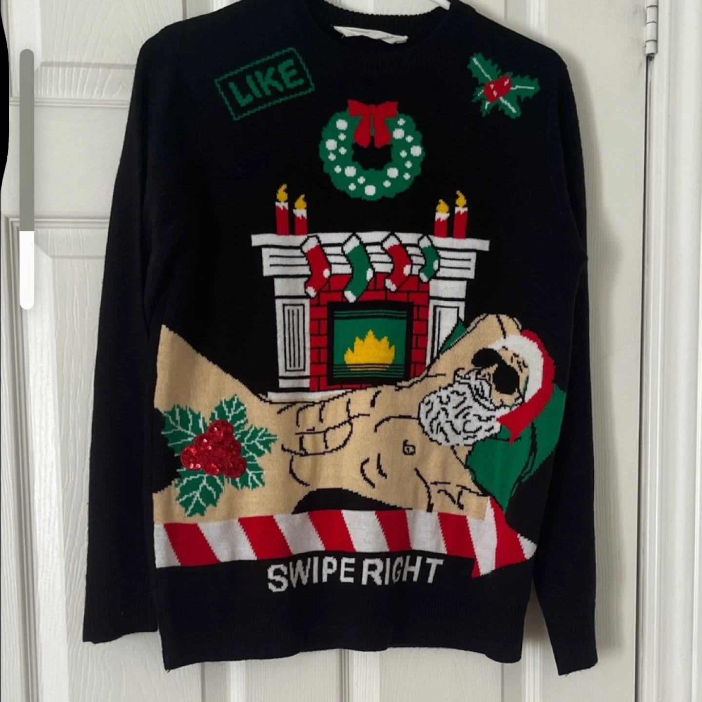 Get ready for some laughs with this Bluenotes 'Ugly Christmas Sweater'! It's a size small and features a funny design with a fireplace, stockings, and a Santa-like figure. Perfect for your next holiday party!