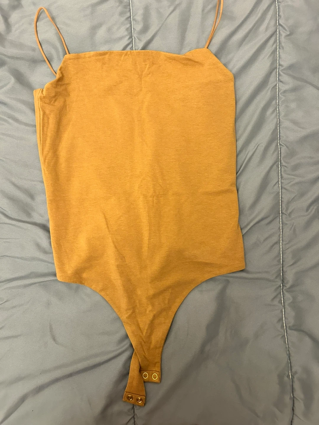 This is a Banana Republic bodysuit in size medium. It's made of cotton, modal, and spandex, so it's super comfy! The colour is a lovely mustard yellow.