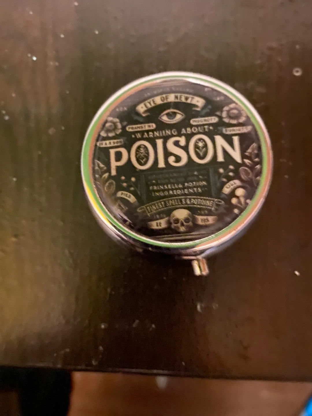 Selling a pill box with a 'Poison' design on the lid. It has three compartments inside. It would be a unique way to store your medication or small items