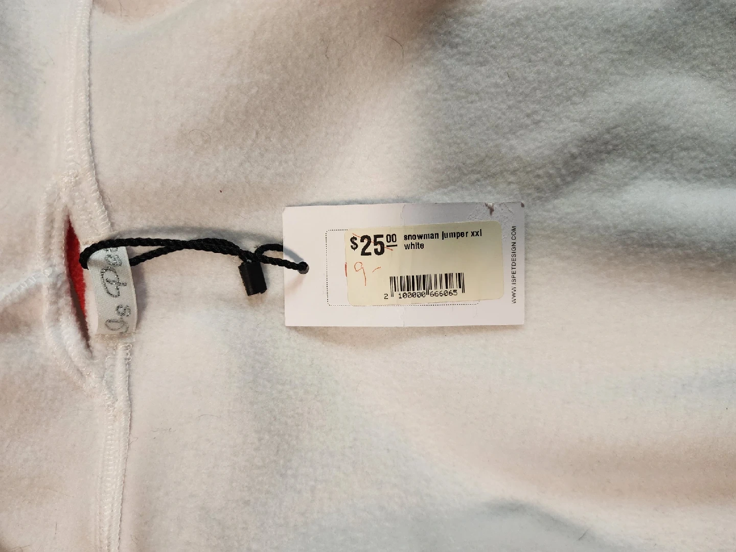 23Here's a cozy snowman jumper in size XXL! Not a true XXL, i would say this is a sm/ med. This does not fit my bully. It's white with red accents and a cute snowman face on the hood. The tag shows it was originally $25. It's made of 100% polyester and is looking for a new home