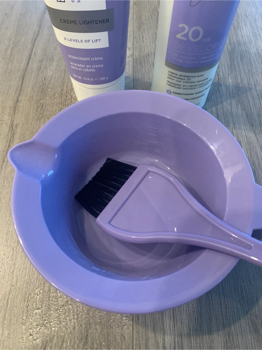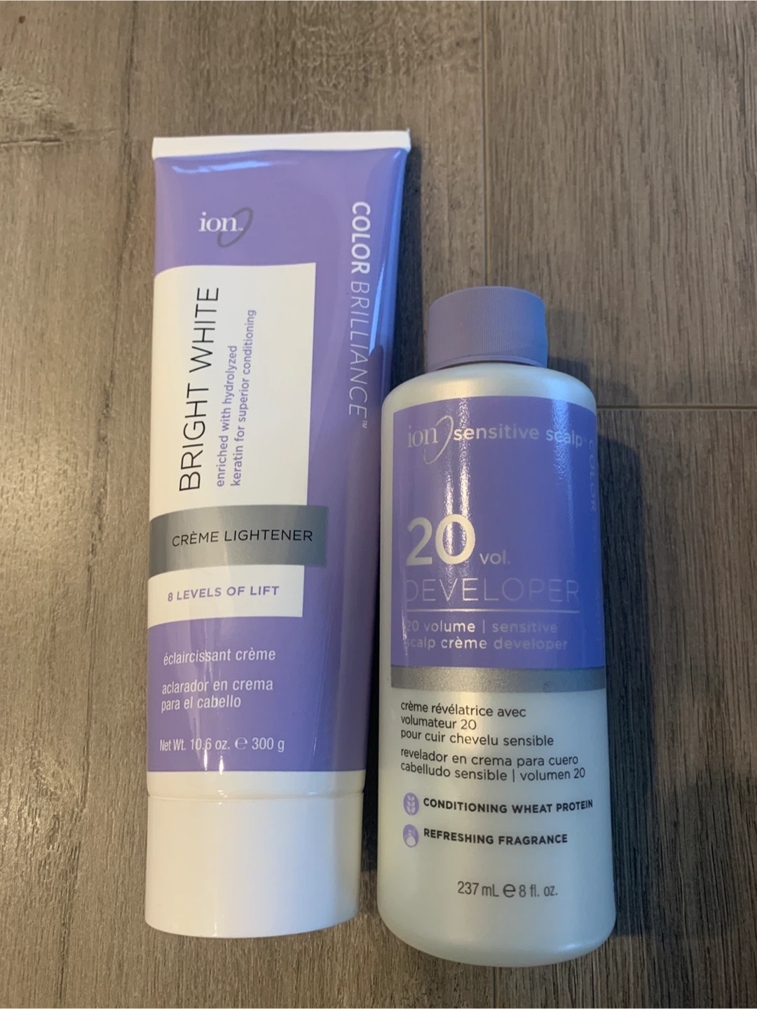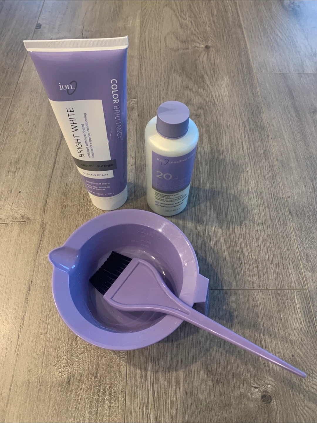 Selling an Ion Color Brilliance Bright White Creme Lightener kit. It includes the creme lightener, 20 volume sensitive scalp developer, mixing bowl, and brush.