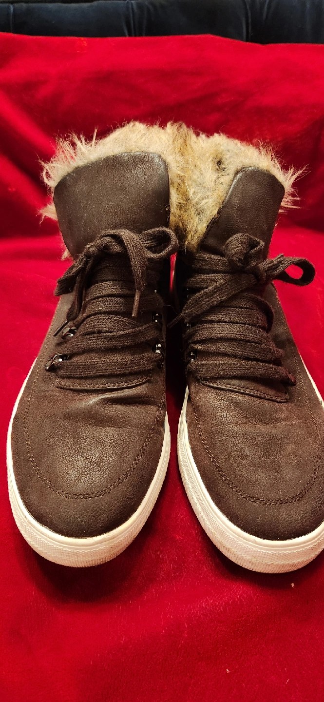 Selling a pair of brown high top sneakers with fur lining! They're a size 10 and in good condition. Perfect for adding a bit of cozy style to your outfit!