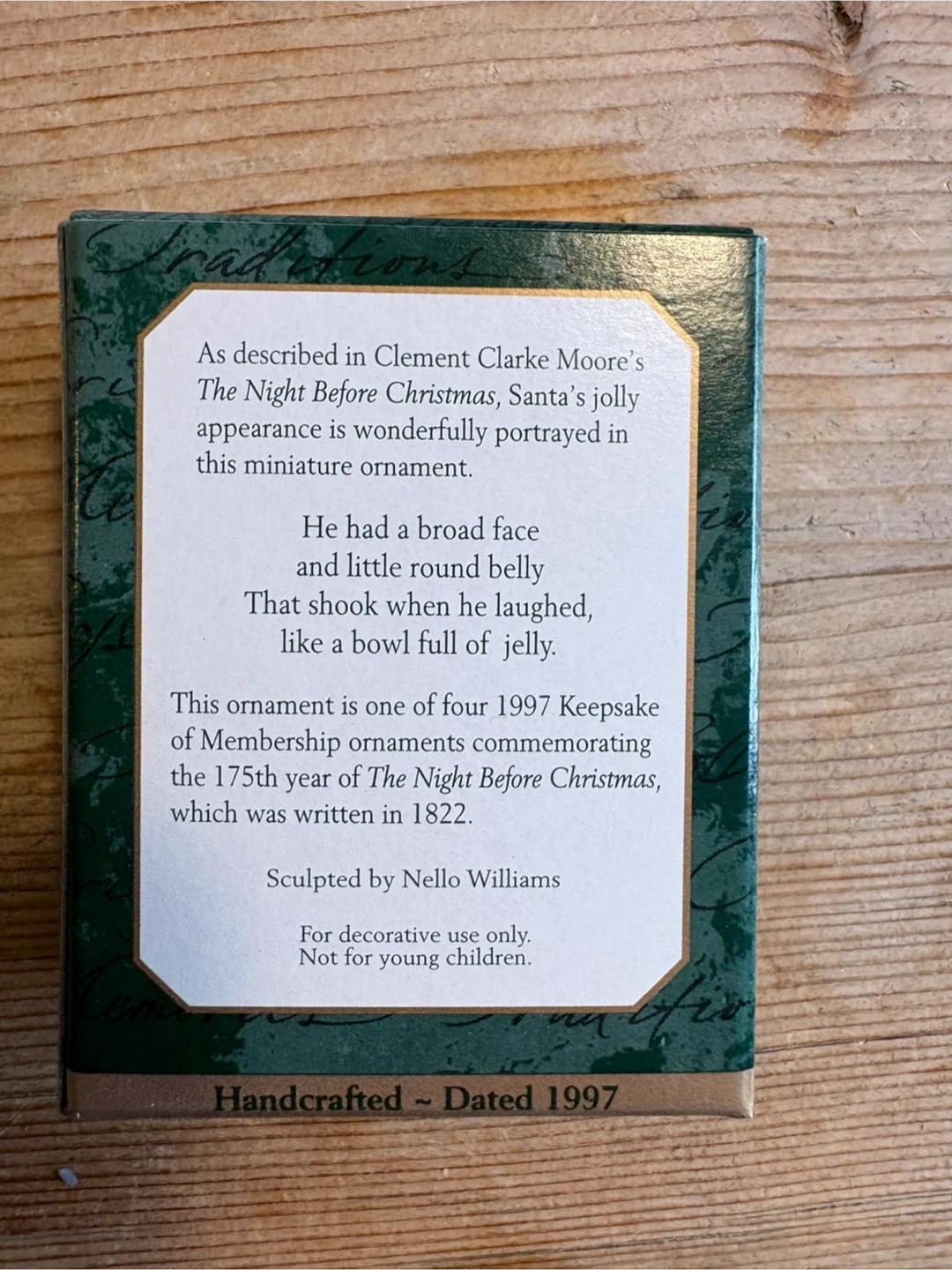 98Selling a Hallmark Keepsake Ornament, Jolly Old Santa. It's a 1997 Miniature Keepsake of Membership ornament. The ornament is sculpted by Nello Williams and is part of the Collector's Club. The box is included!