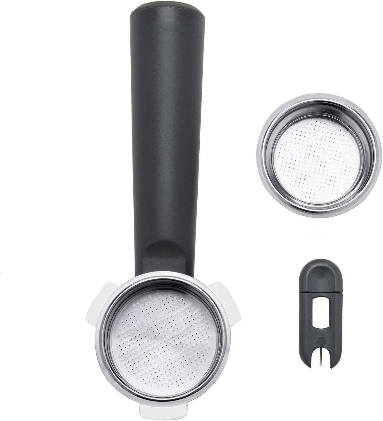 Comes with a stainless steel jug, single shot filter and double shot filter, and it has a milk steamer attached to the machine.