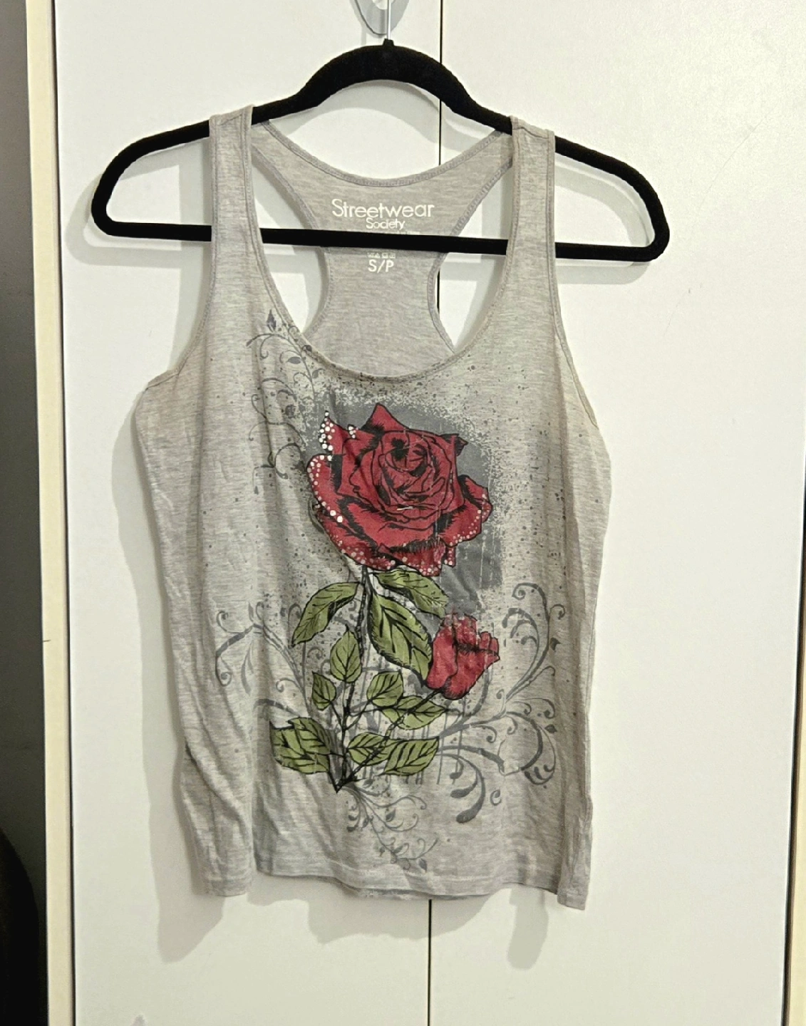 161Selling a Vintage Streetwear Society tank top. It's a light grey colour and size small. It features a rose design on the front