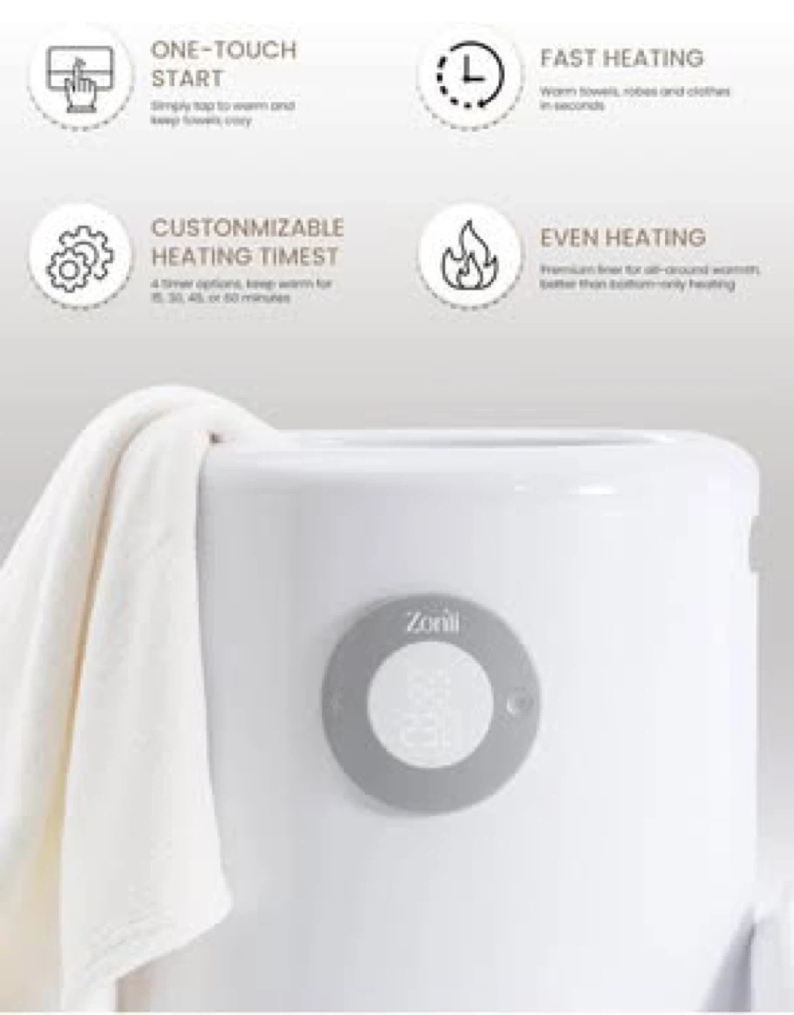 Enjoy spa-like warmth at home with this Zonli towel warmer! It features an extra-large 20L capacity, perfect for warming 2 large bath towels, a bathrobe, or even a personal blanket. The one-touch start and customizable heating times make it super easy to use. Plus, it offers even heat distribution and smart temperature control for energy efficiency