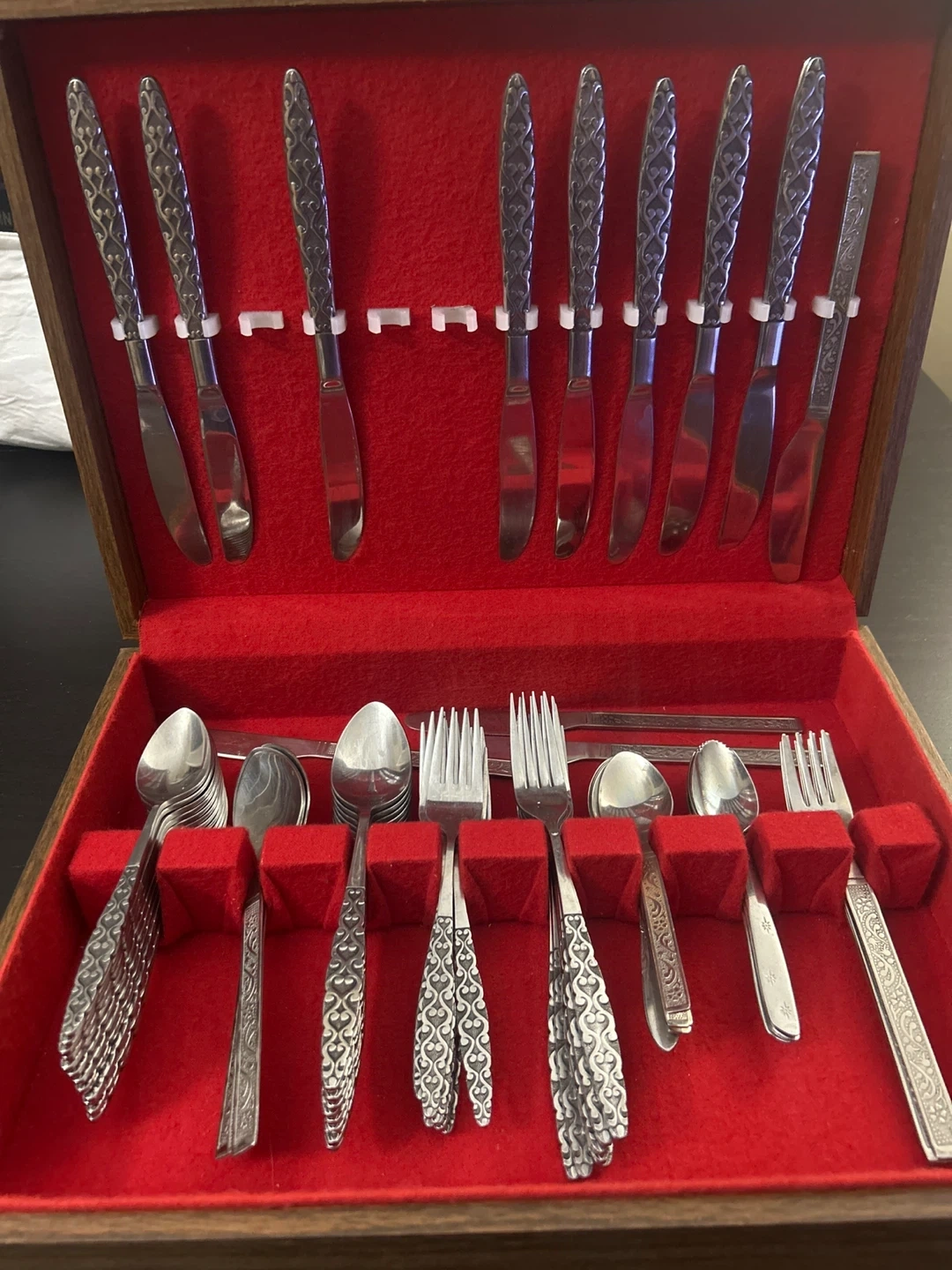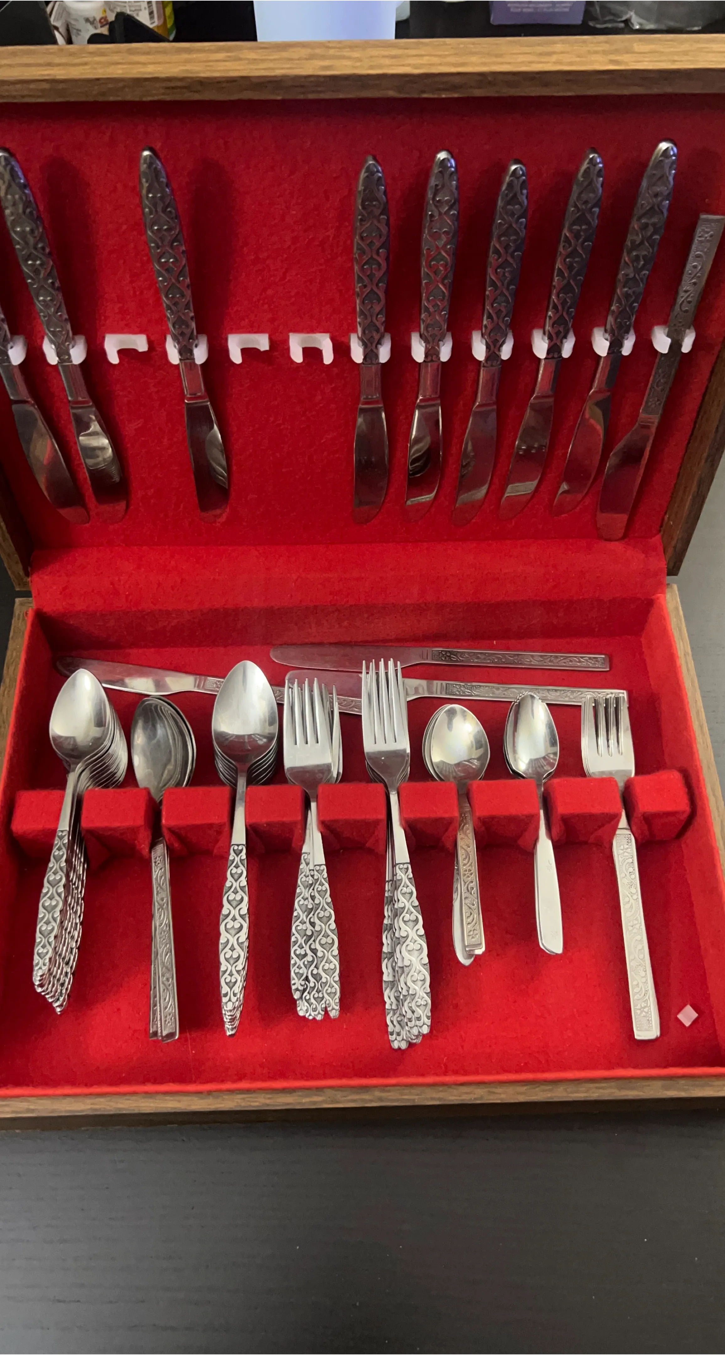 Selling a vintage silverware set, complete with a wooden storage box! The set includes knives, forks, and spoons, all neatly arranged in a red velvet-lined box. Perfect for adding a touch of elegance to your dining experience or for completing a vintage collection