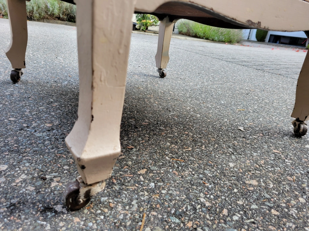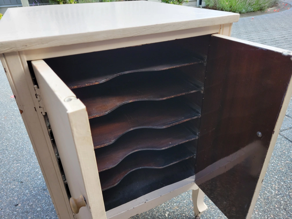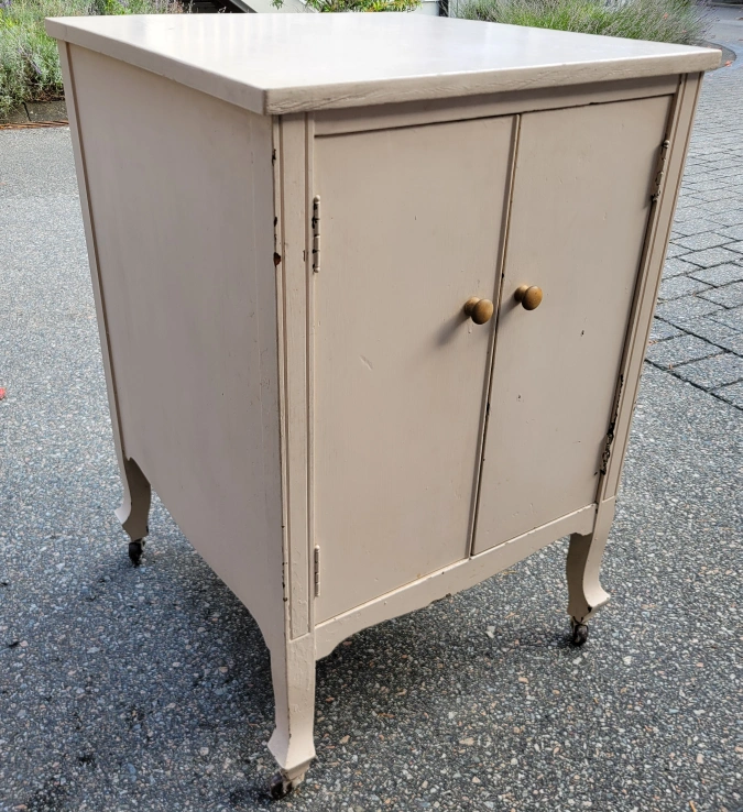 Here's a nice Vintage cabinet on casters . It's a off-white colour and measures approximately 20.5 inches wide, 22 inches deep, and 31 inches high. It has two doors and interior shelving. Delivery available if needed. Let me know if you are interested. Thanks.