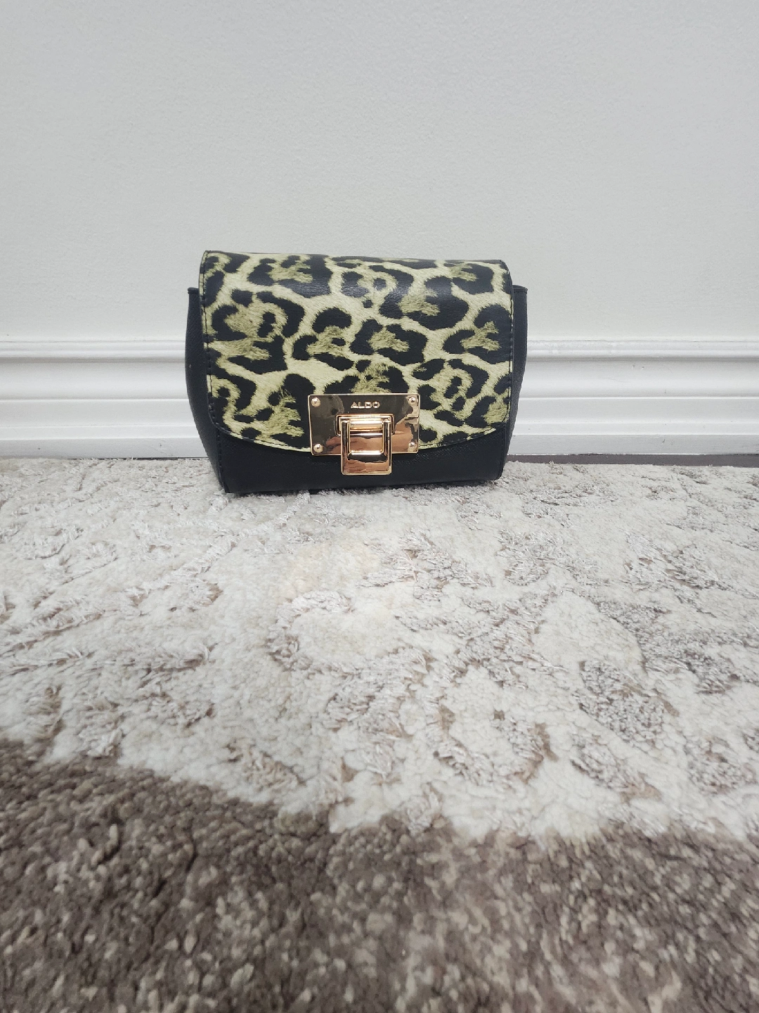 Cute Aldo crossbody bag with a fun leopard print top and black bottom. It has a gold clasp and is in great condition. Perfect for adding a little flair to any outfit!