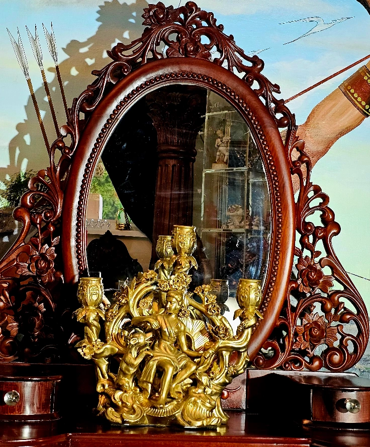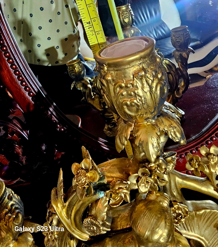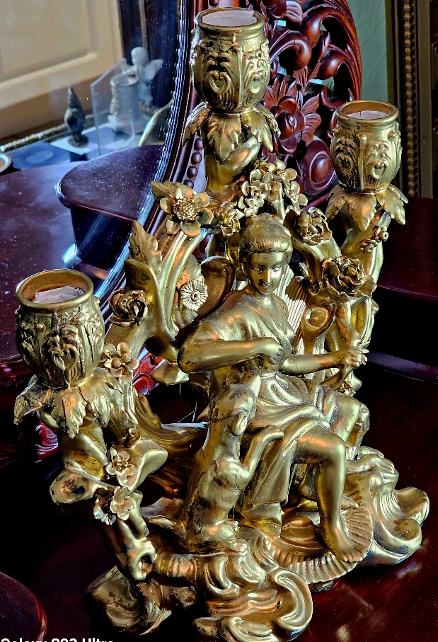 Selling a vintage gold candlestick holder. It's a beautiful piece with intricate details, featuring a woman, dog, and floral accents. Perfect for adding a touch of elegance to any room!