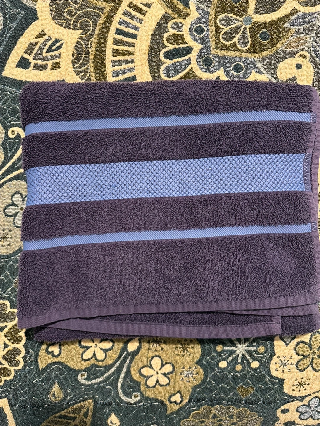 105Blue bath towel with light blue stripes. It's in great condition and ready for a new home! The towel is soft and absorbent, perfect for everyday use after a shower or bath