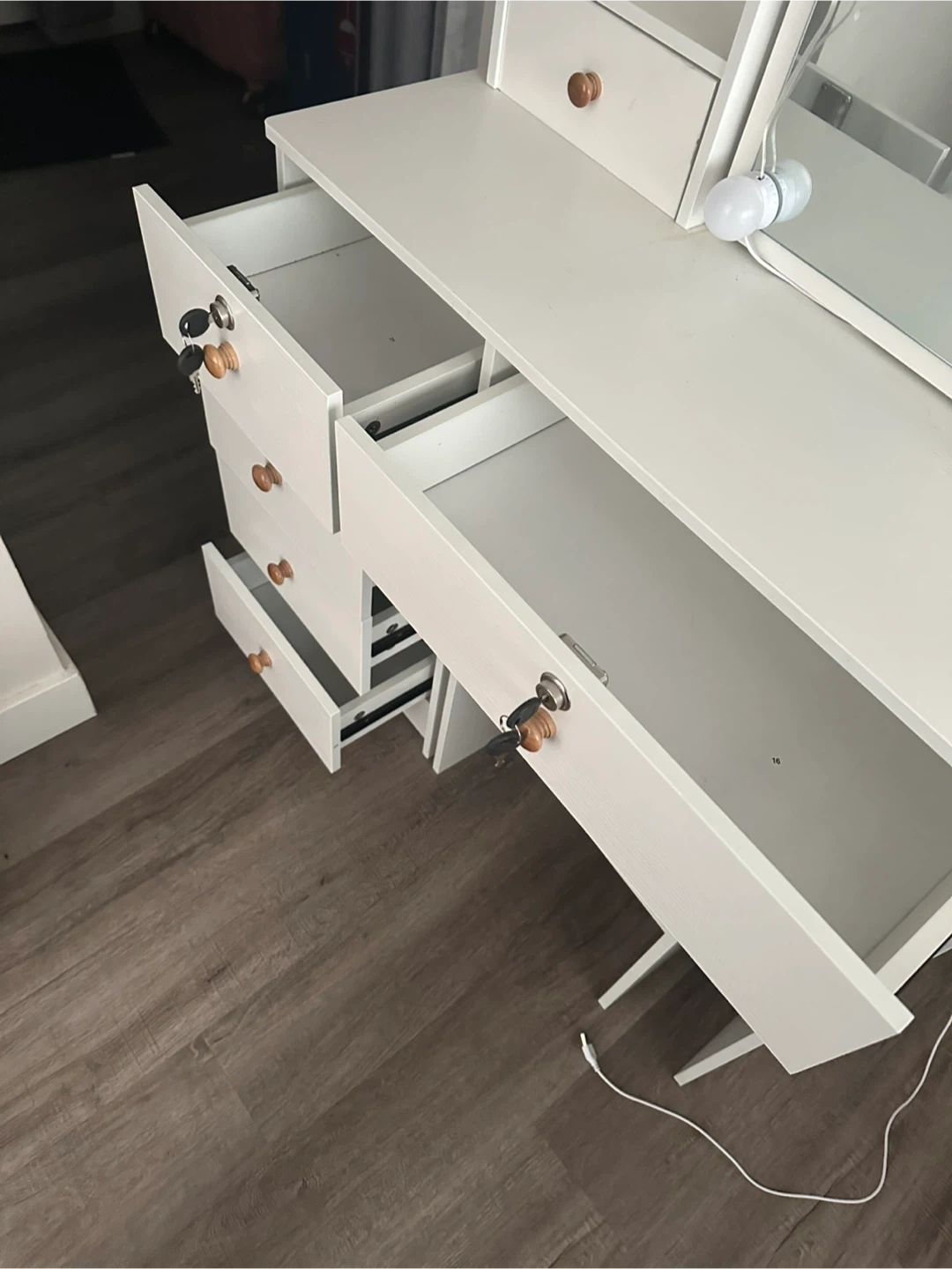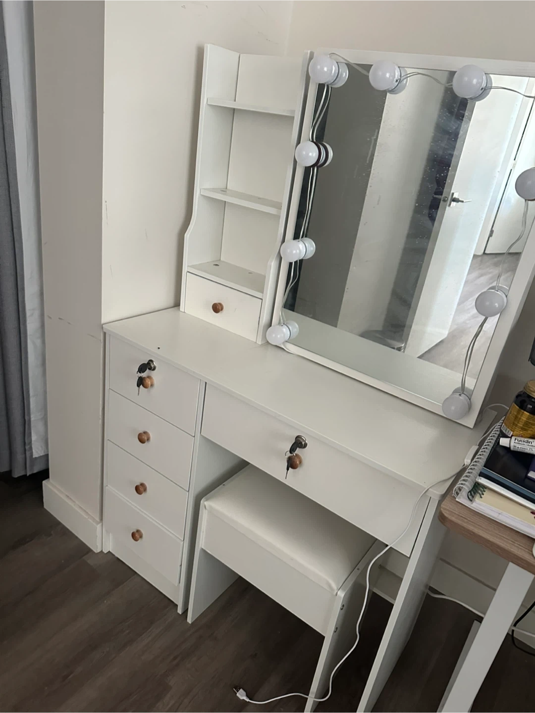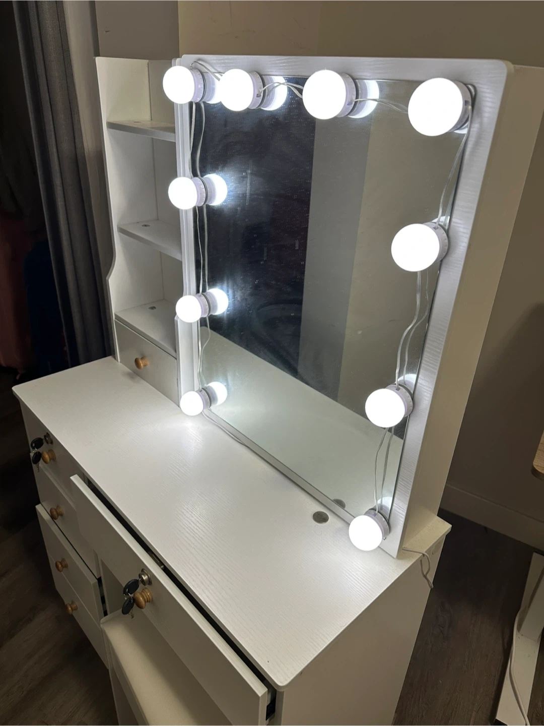 67Selling a lovely white vanity table with a lighted mirror! It comes with drawers for storage and a comfortable stool. Perfect for getting ready in style! Dimensions: 32 x 14 x 53
