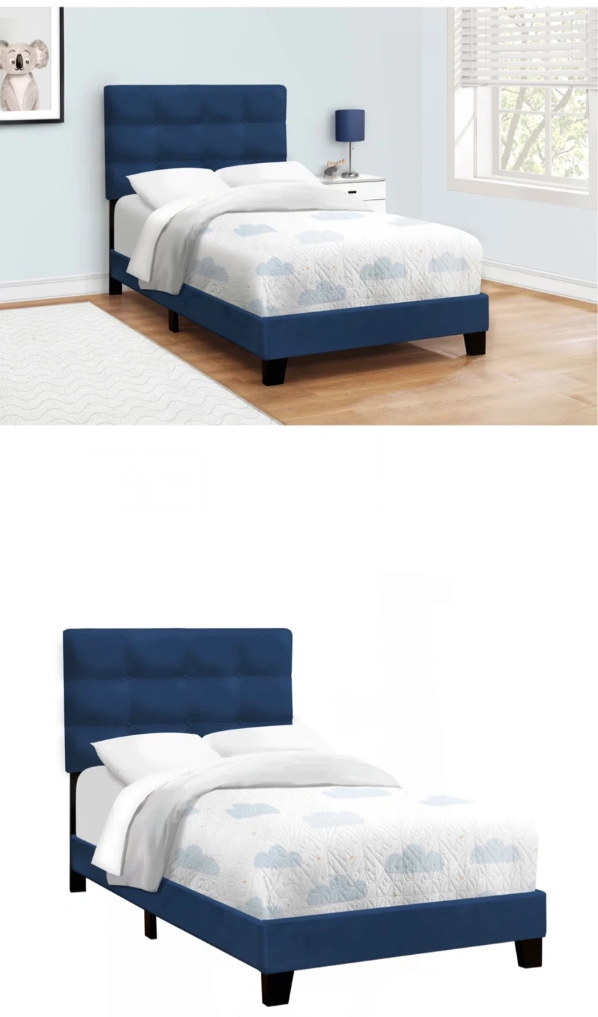 Selling a blue upholstered twin bed frame. It's in great shape and would be perfect for a kid's room or guest room! The bed frame has a simple, modern design that will complement any decor