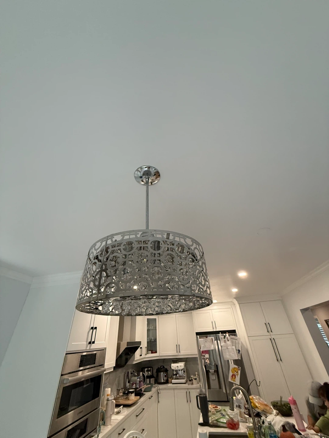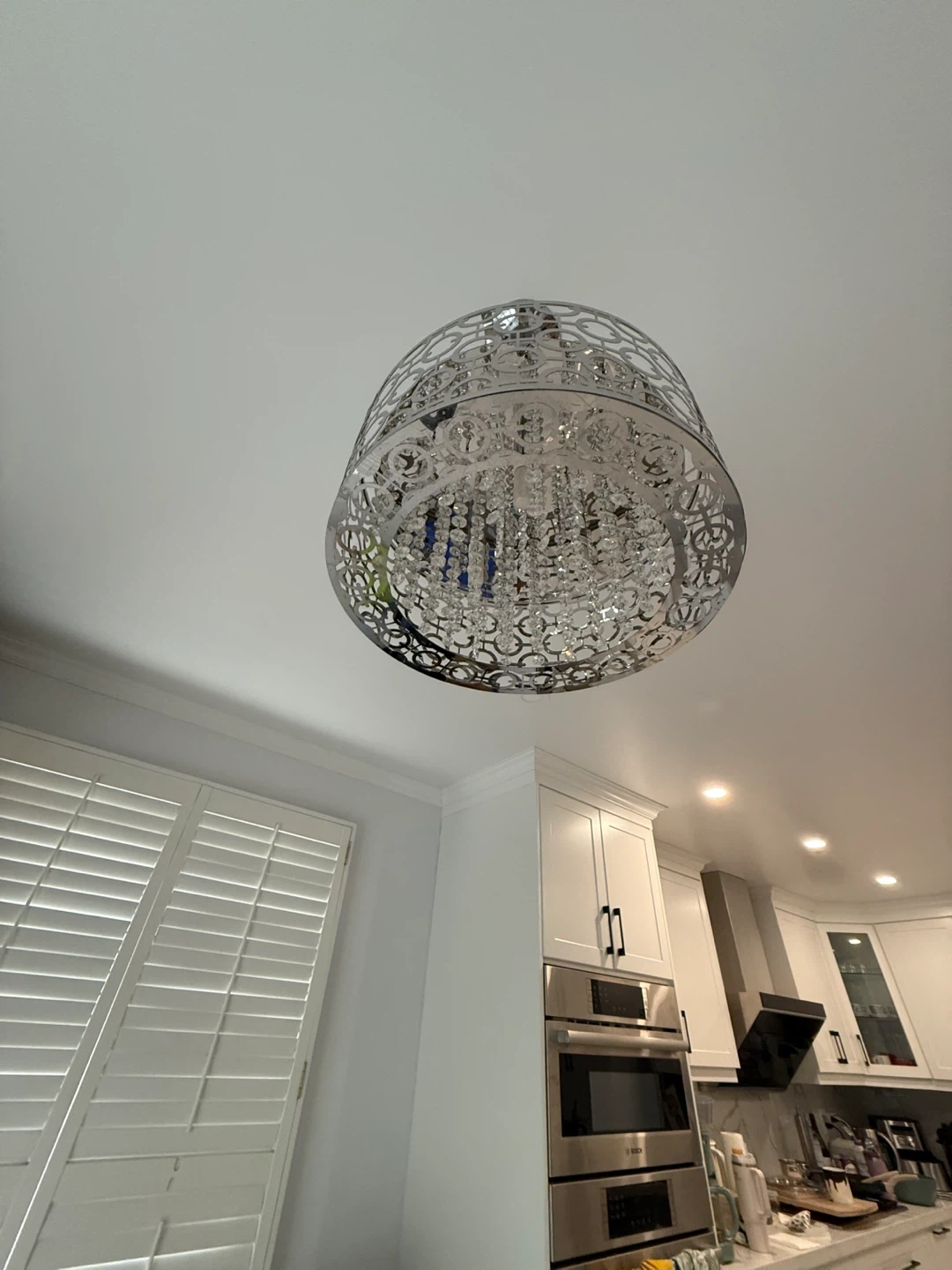 This is a chrome-finished drum shade chandelier with a laser-cut metal web design and crystal accents.