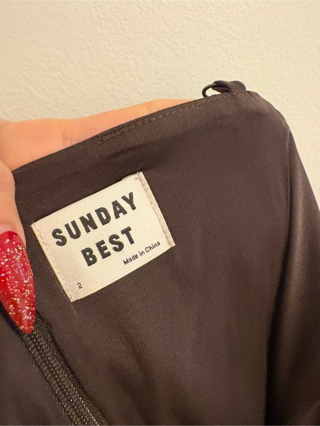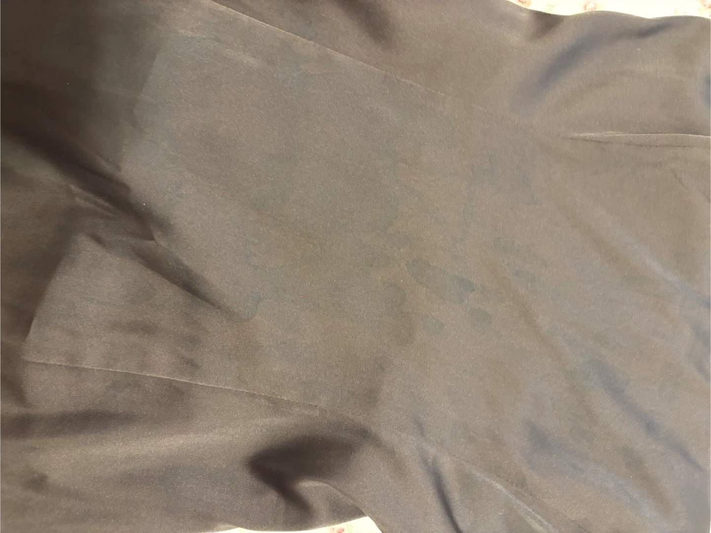 It looks black but it’s a dark brown. There’s a stain mark but you can’t really tell when you’re wearing it. This mini dress is a size 2.