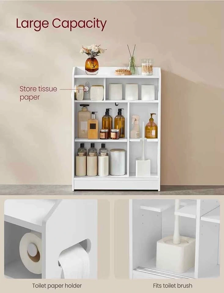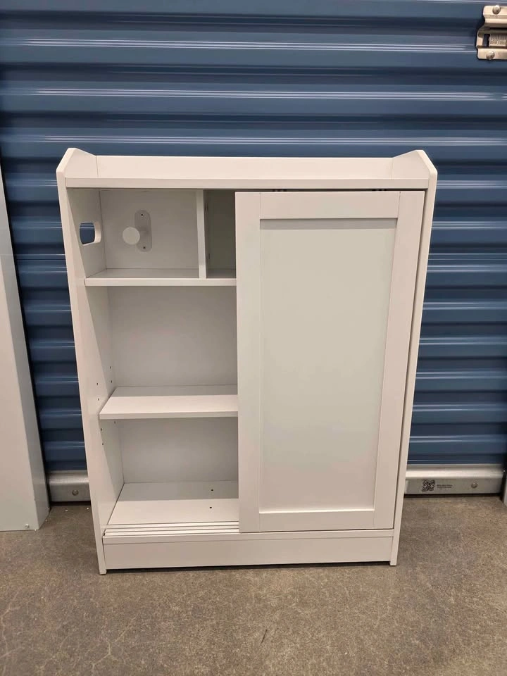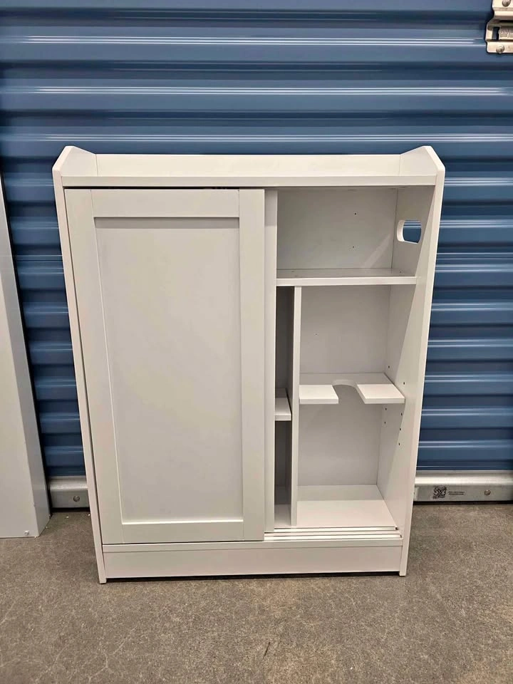 49Compact bathroom cabinet with sliding door, adjustable shelves, and built-in toilet paper holder. Perfect for organizing toiletries and saving space in tight areas. Brand new, pulled from a liquidation pallet. Pickup.