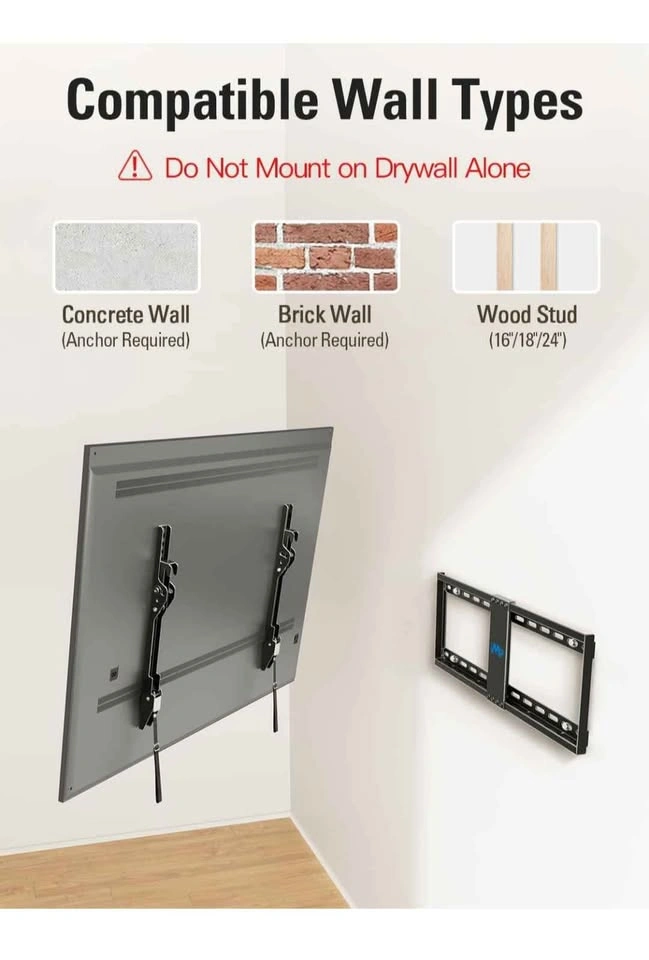 Brand new universal TV mount tilt. TV wall mount fits for 37-75" TV up to 132 lbs, with max VESA/mounting holes spacing of 600 x 400mm. Please check the TV VESA, TV weight, 16/18/24 inch wood studs spacing and possible blocked input before purchasing. Patent No.:29/639,502.
