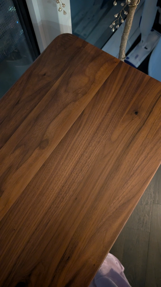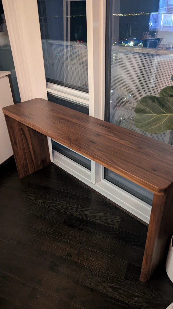 Selling a beautiful console table made of walnut wood. It's a lovely piece that would fit well in an entryway or living room. The wood grain is really nice and adds a touch of warmth to any space!