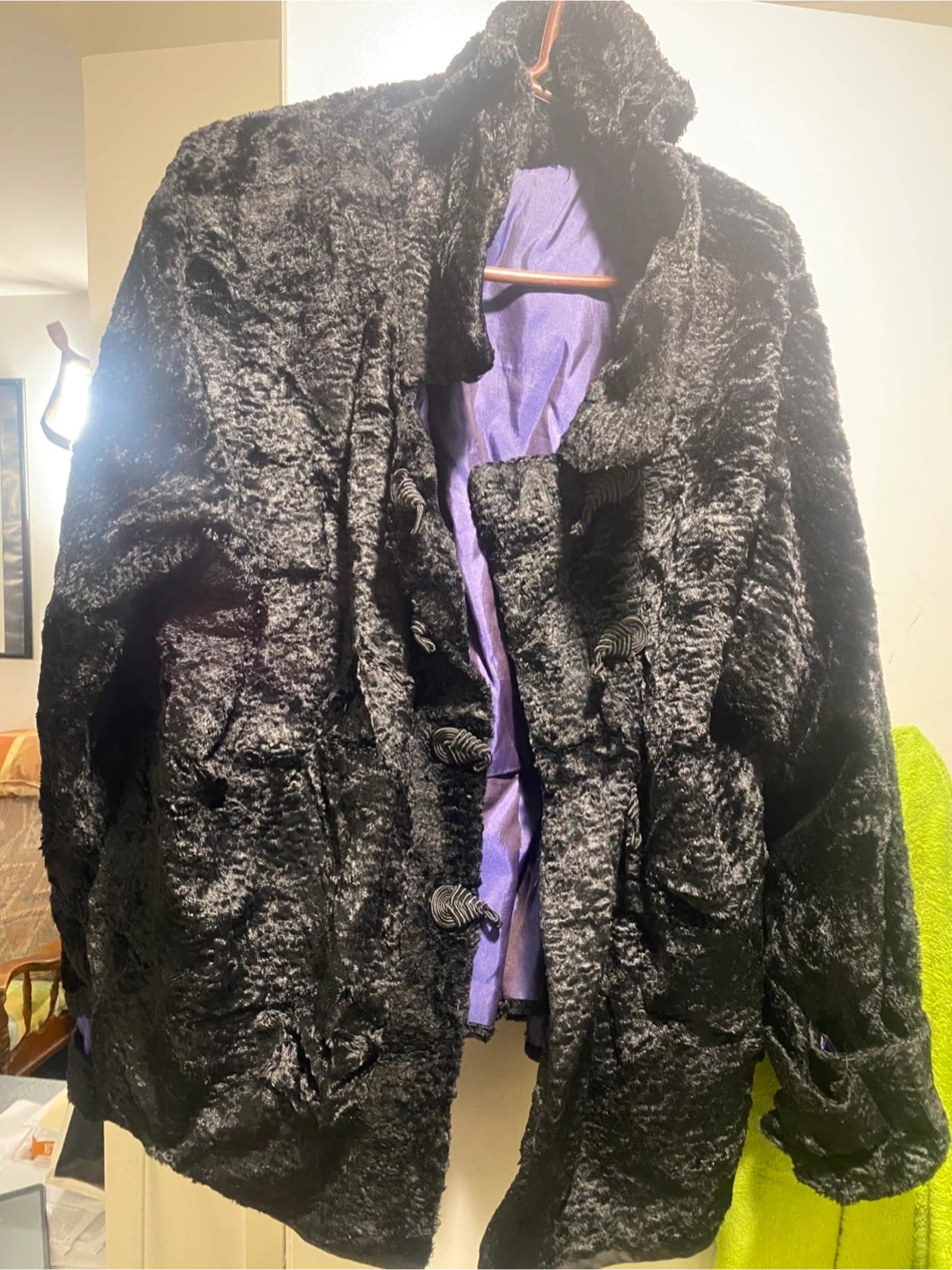 Selling a black Persian Lamb coat. It has a unique texture and a stylish design with decorative buttons. The inner lining is a vibrant purple color