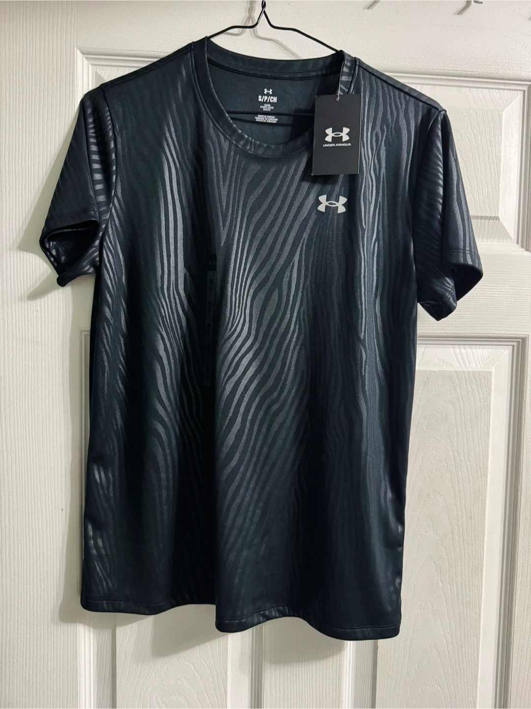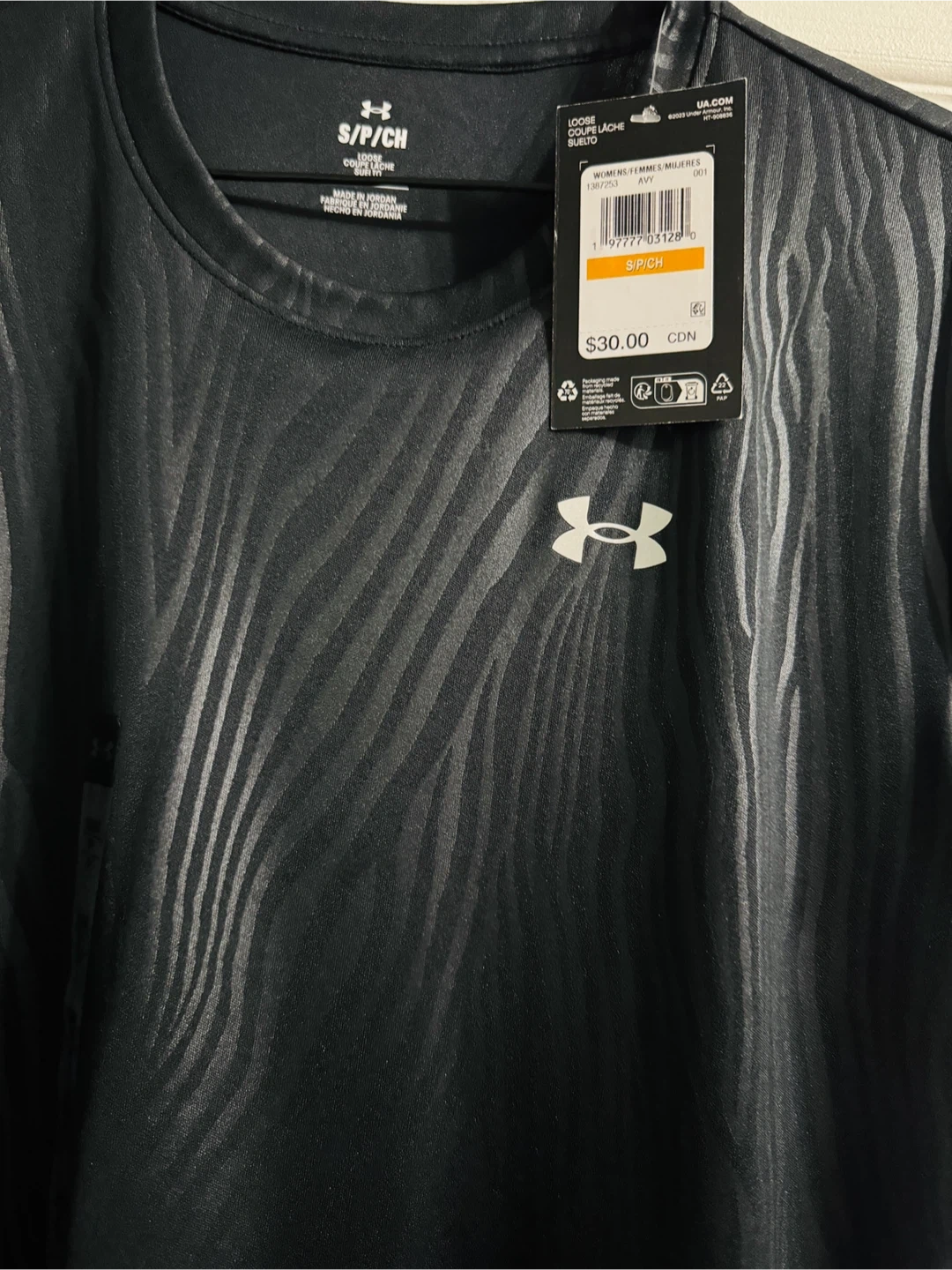 Selling a brand new Under Armour t-shirt with tags still attached! It's a size small and features a cool black and grey pattern. The original price tag shows $30 CDN.