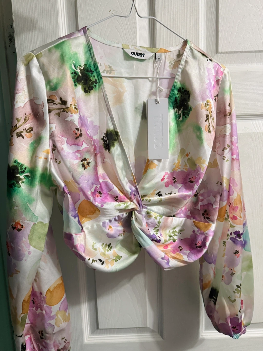 Selling a beautiful floral twist front top from OUTRYT in size L! It's in great condition and features a lovely floral pattern. Perfect for adding a pop of colour to your wardrobe!