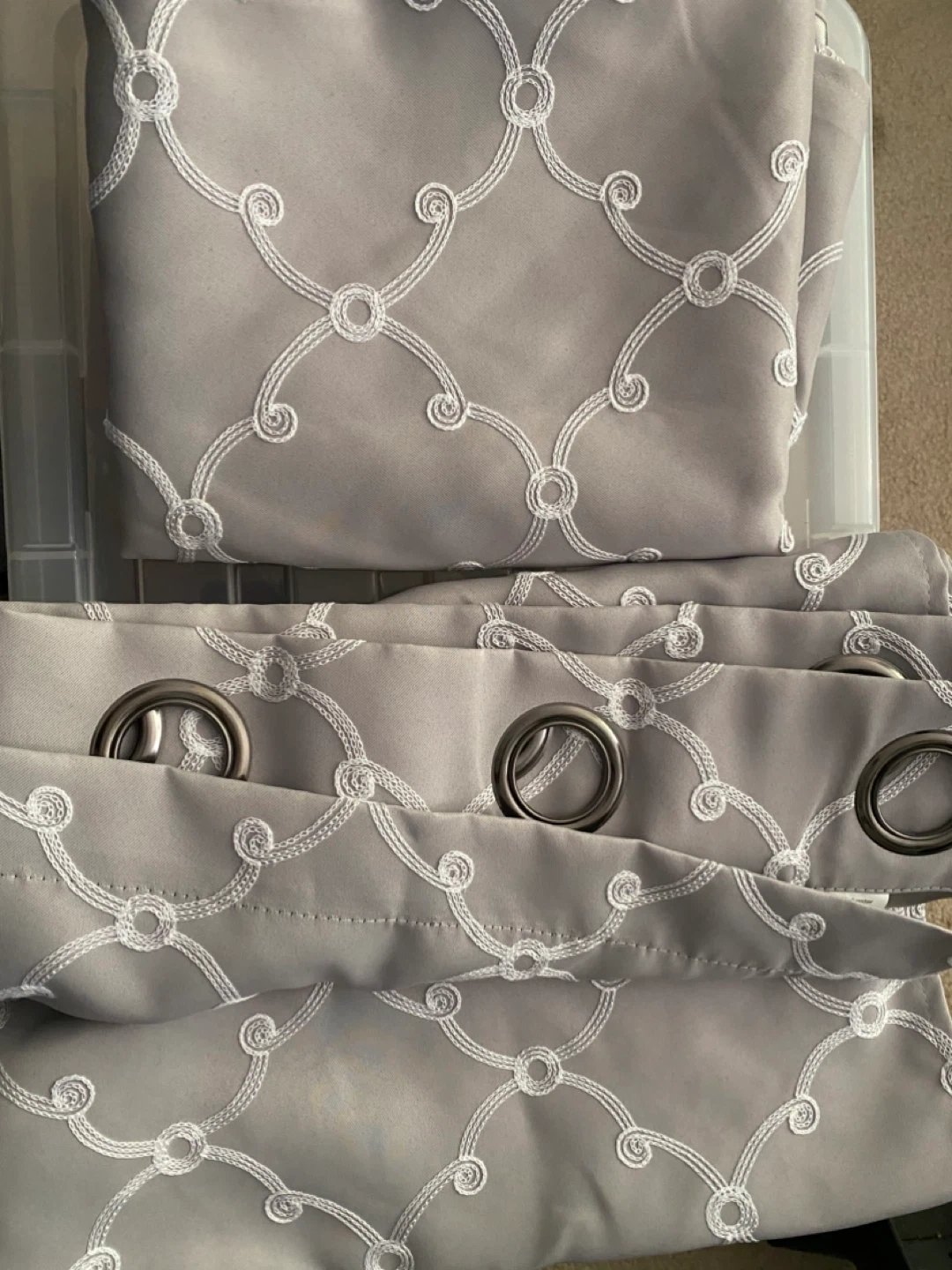 Selling a set of grey curtains with a nice patterned design. They have grommets at the top for easy hanging. Perfect for adding a touch of elegance to any room! Black out style!