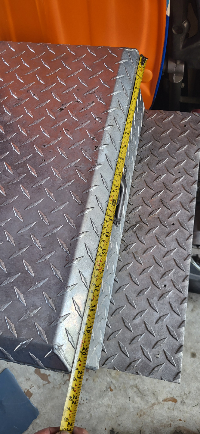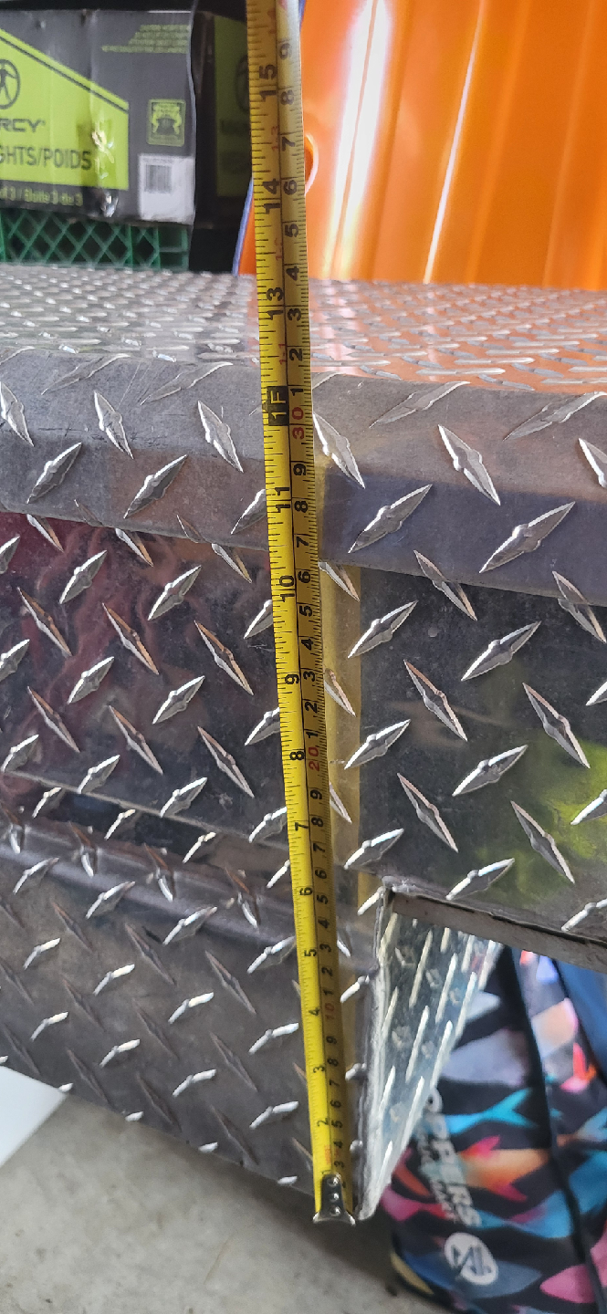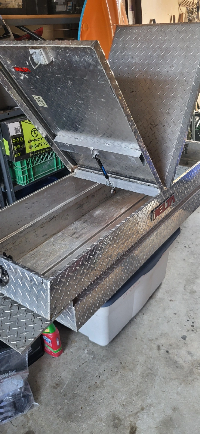 Delta aluminum truck bed tool box in good condition. It's a sturdy and reliable way to keep your tools safe and organized. The toolbox is silver and has a diamond plate pattern. It measures approximately 53 inches in length.