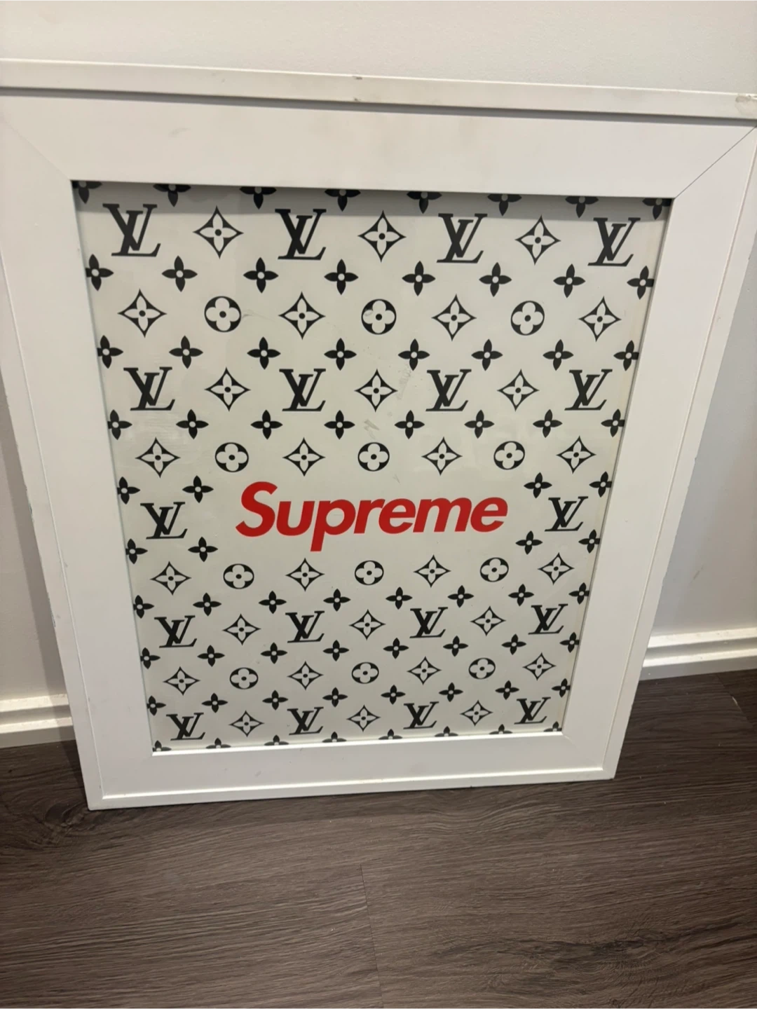 Selling a framed art piece featuring the iconic Louis Vuitton monogram pattern with the Supreme logo. It's in great condition and would look great in any room. The frame is white and complements the design well!