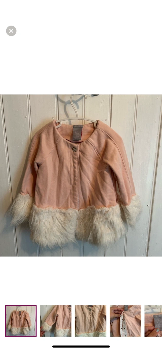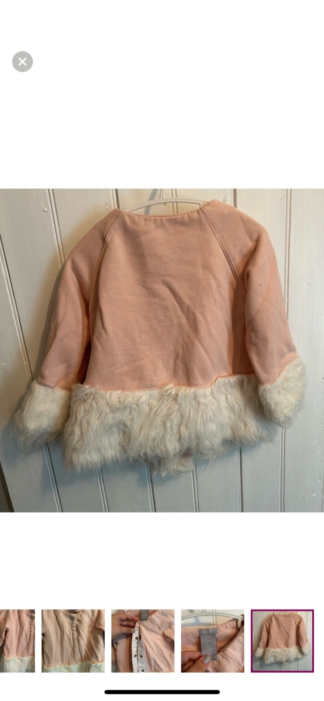 Tahari brand. Button up jacket with faux fur tin. Snap buttons with one faux button at the top. Pink with white faux fur. Size 3t. Brand new condition but fur has some wash wear