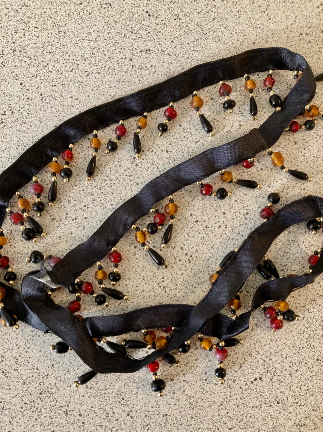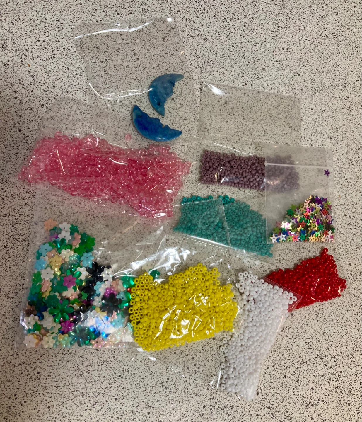 Nine bags of unused seed beads, sequins, soapstone moons and 1yd of beaded trim. See photos for details.