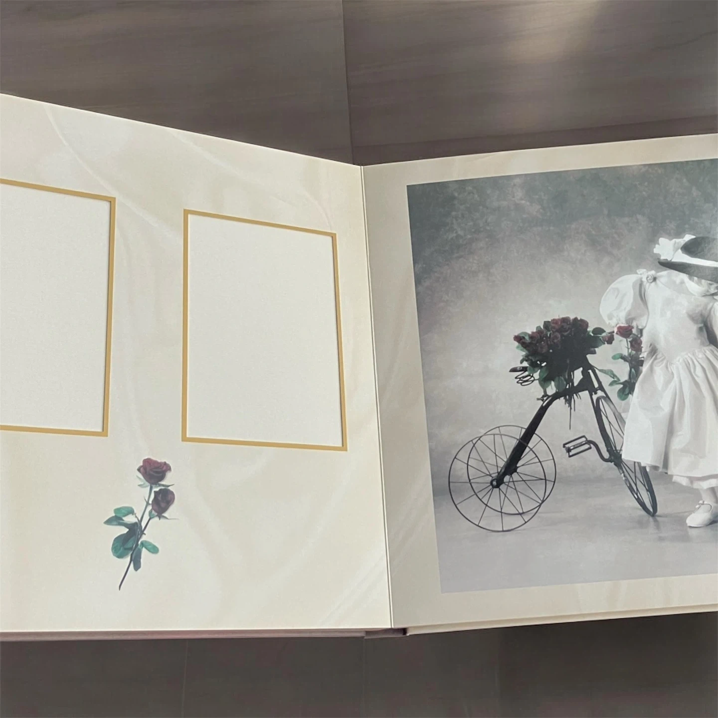 The album measures approximately 11.25" X 11.25" and has a variety of sized options for photos inside. Every page has different photo slot sizes to fit various dimensions of photographs - along with a picture of one of her trademark children's photos.
