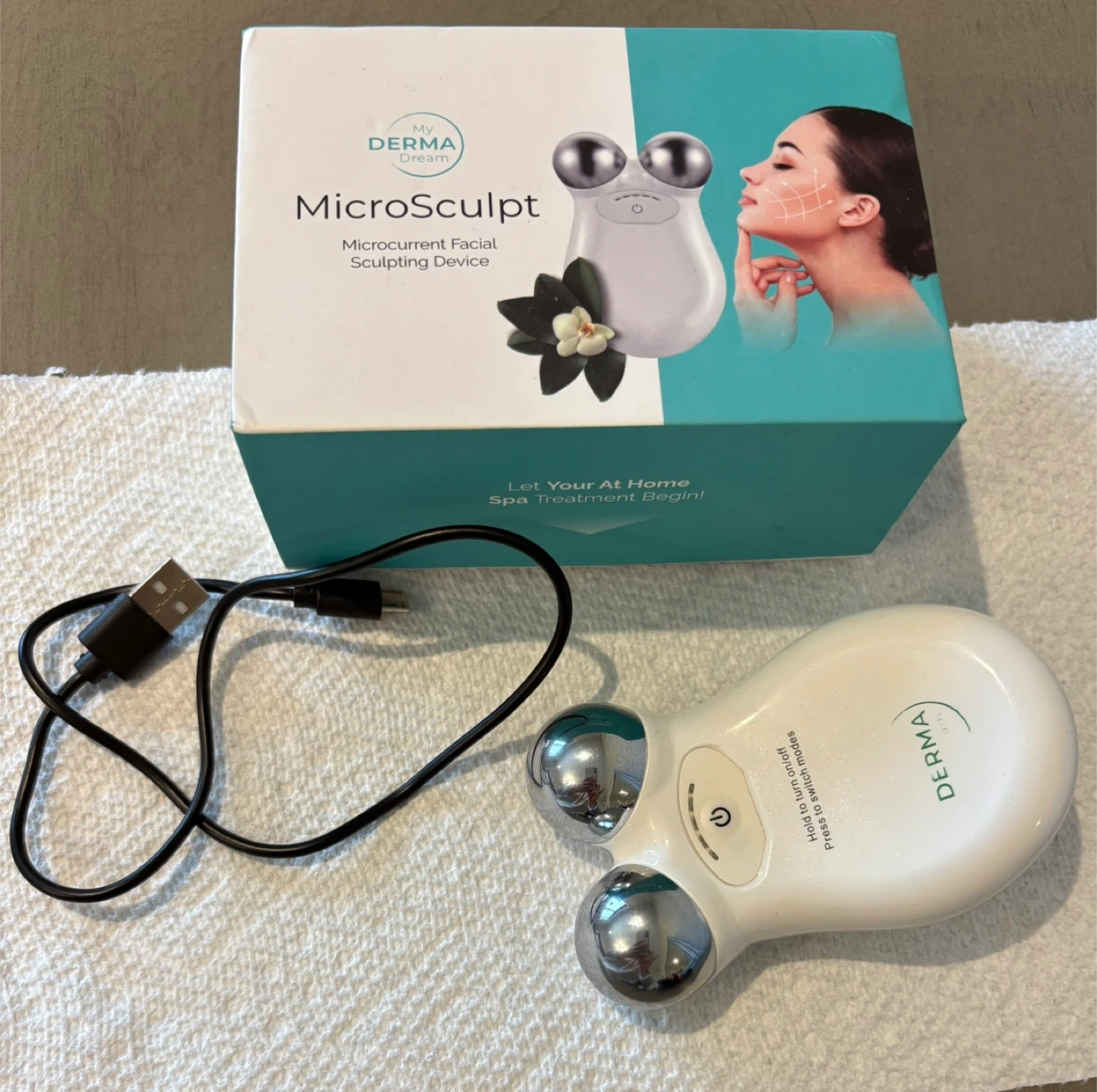 Selling a Derma Dream MicroSculpt Microcurrent Facial Sculpting Device. This device is designed to sculpt your face using microcurrent technology. It comes with the box and charging cable. Let your at-home spa treatment begin!
