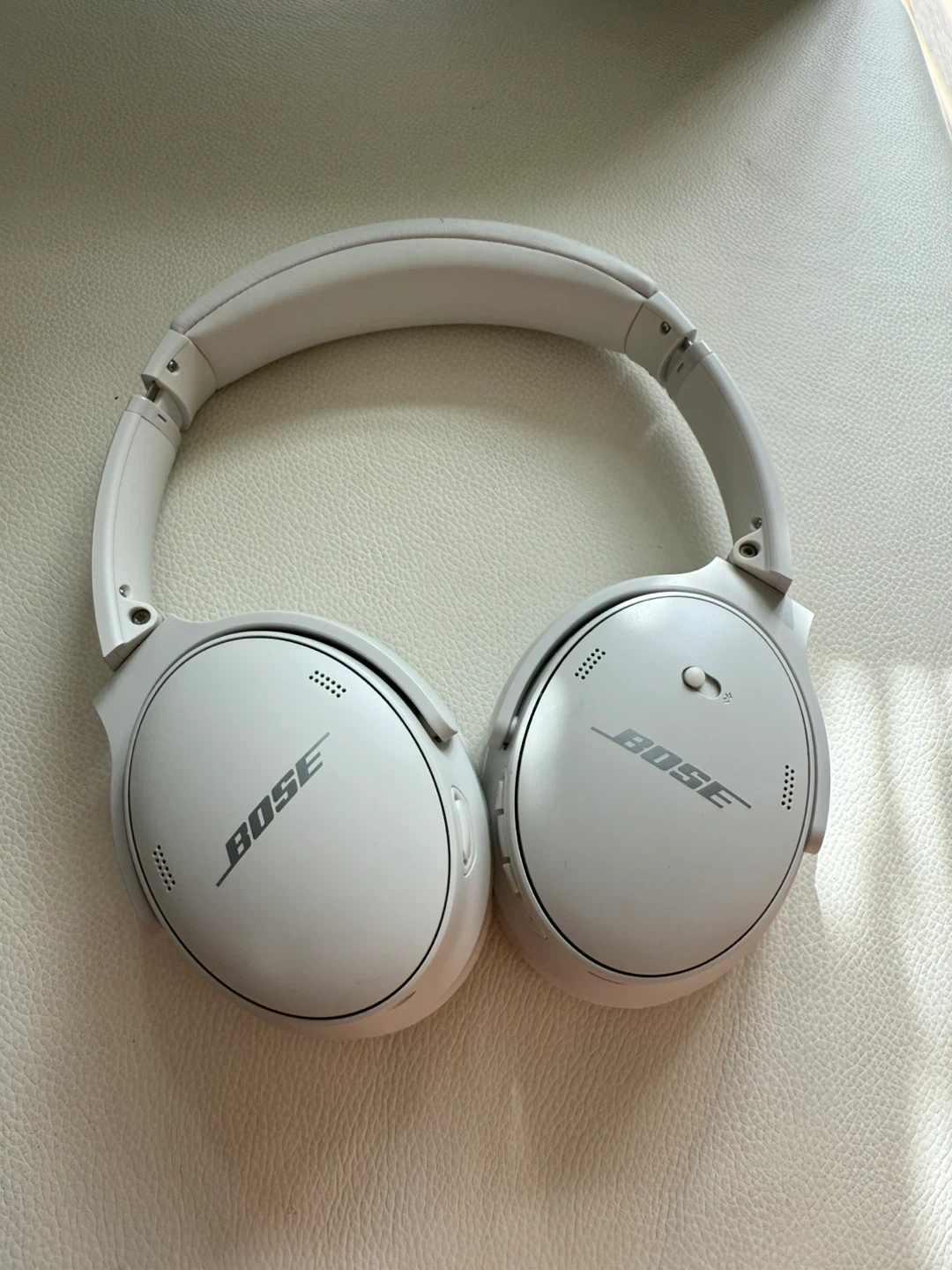 Selling a pair of Bose QuietComfort 45 headphones in white! They're in great condition and come with the original case. These headphones are known for their excellent noise cancellation and comfortable fit, perfect for travel or just relaxing at home