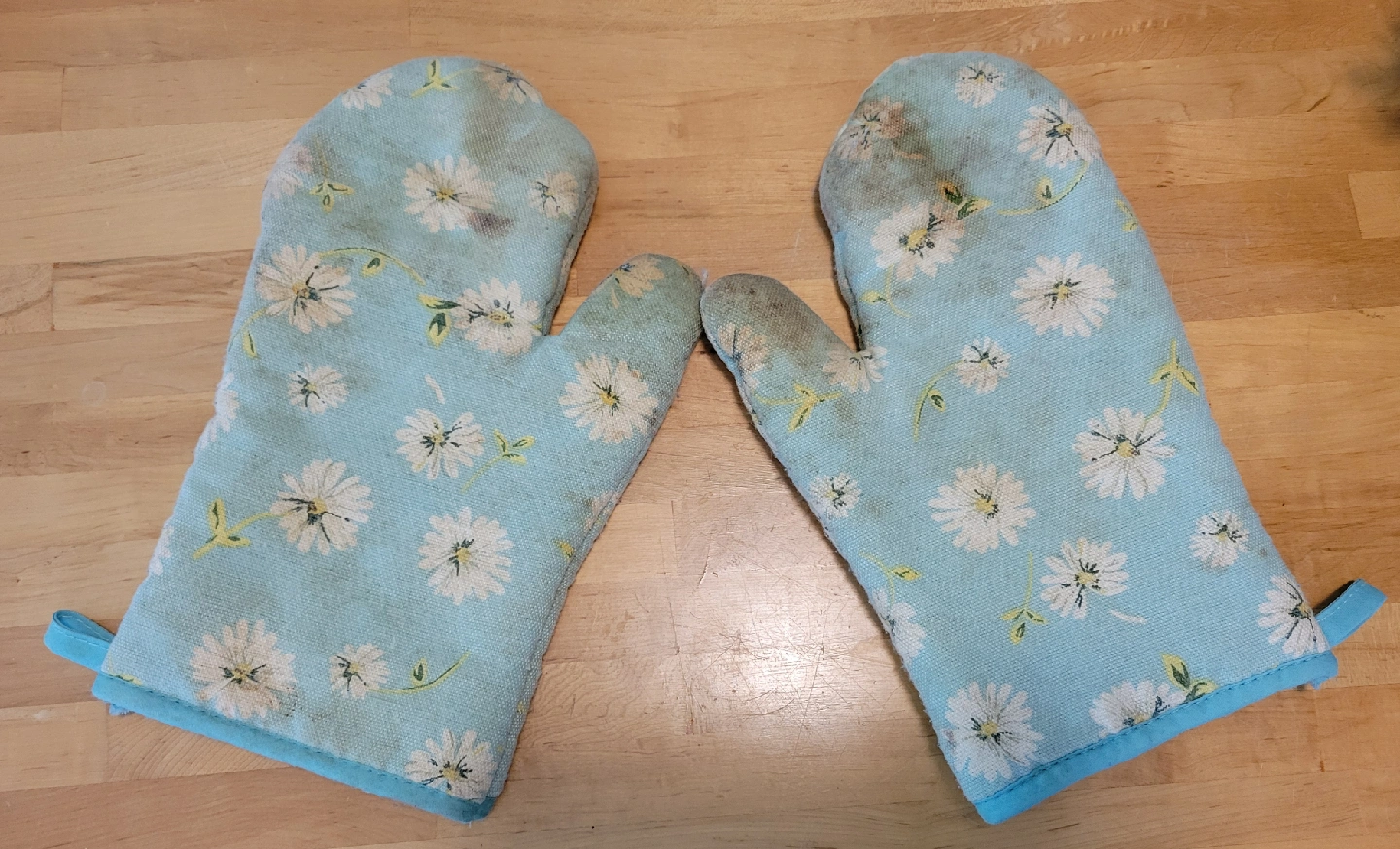 Pair of oven mitts with a light blue background and white floral pattern. They show some signs of use, as seen in the photos