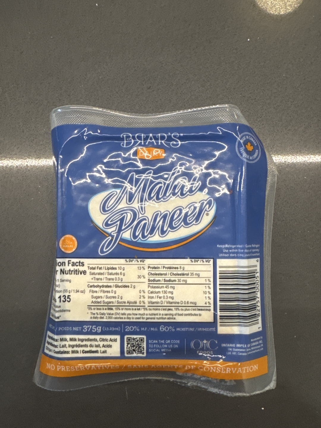 Selling a 375g package of Baar's Malai Paneer. It's made with milk and milk ingredients and is a source of protein. Perfect for your next Indian dish!