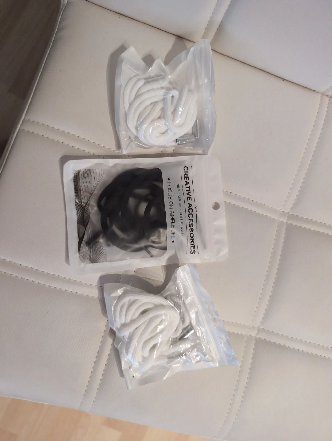 I have shoelaces from Creative Accessories. There are two white pairs and one black pair. They are still in the original packaging and have never been used, so they're in new condition!