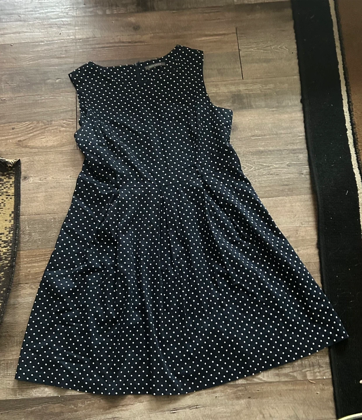 Cute Suzy Shier dress with a black background and white polka dots. It's sleeveless and perfect for summer!