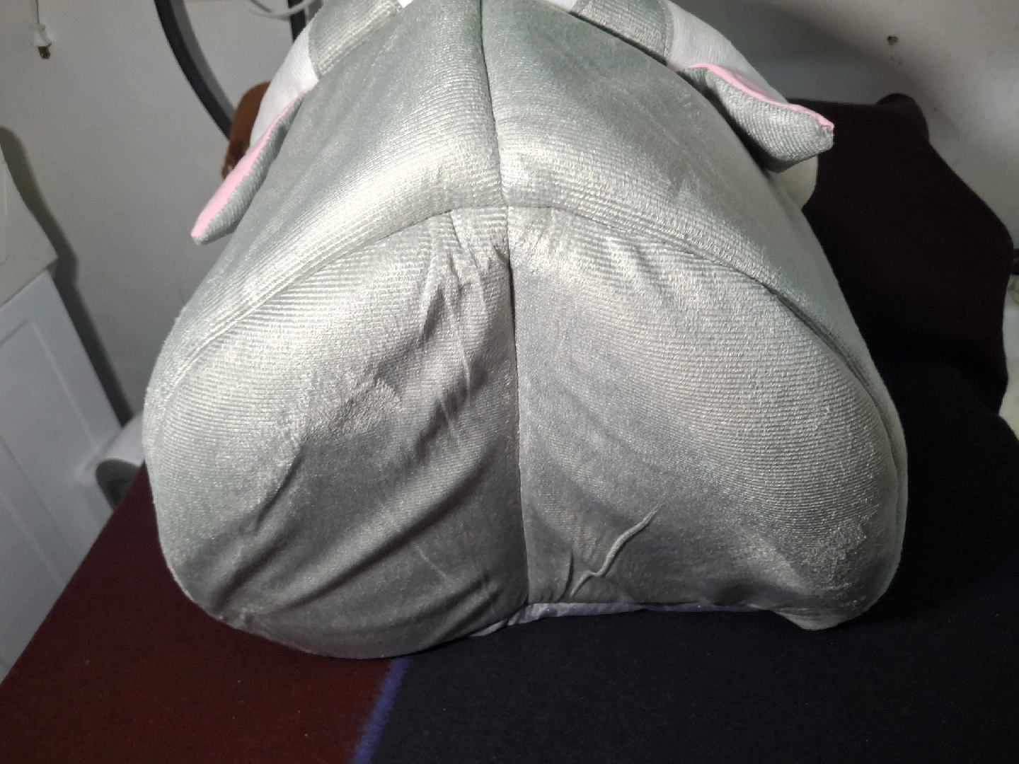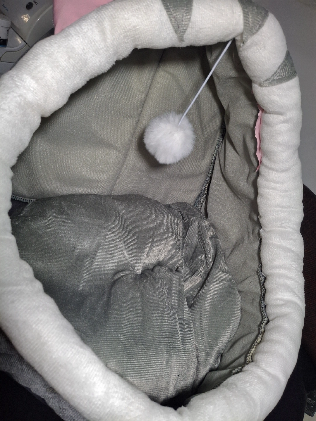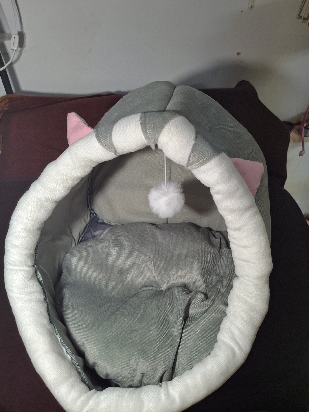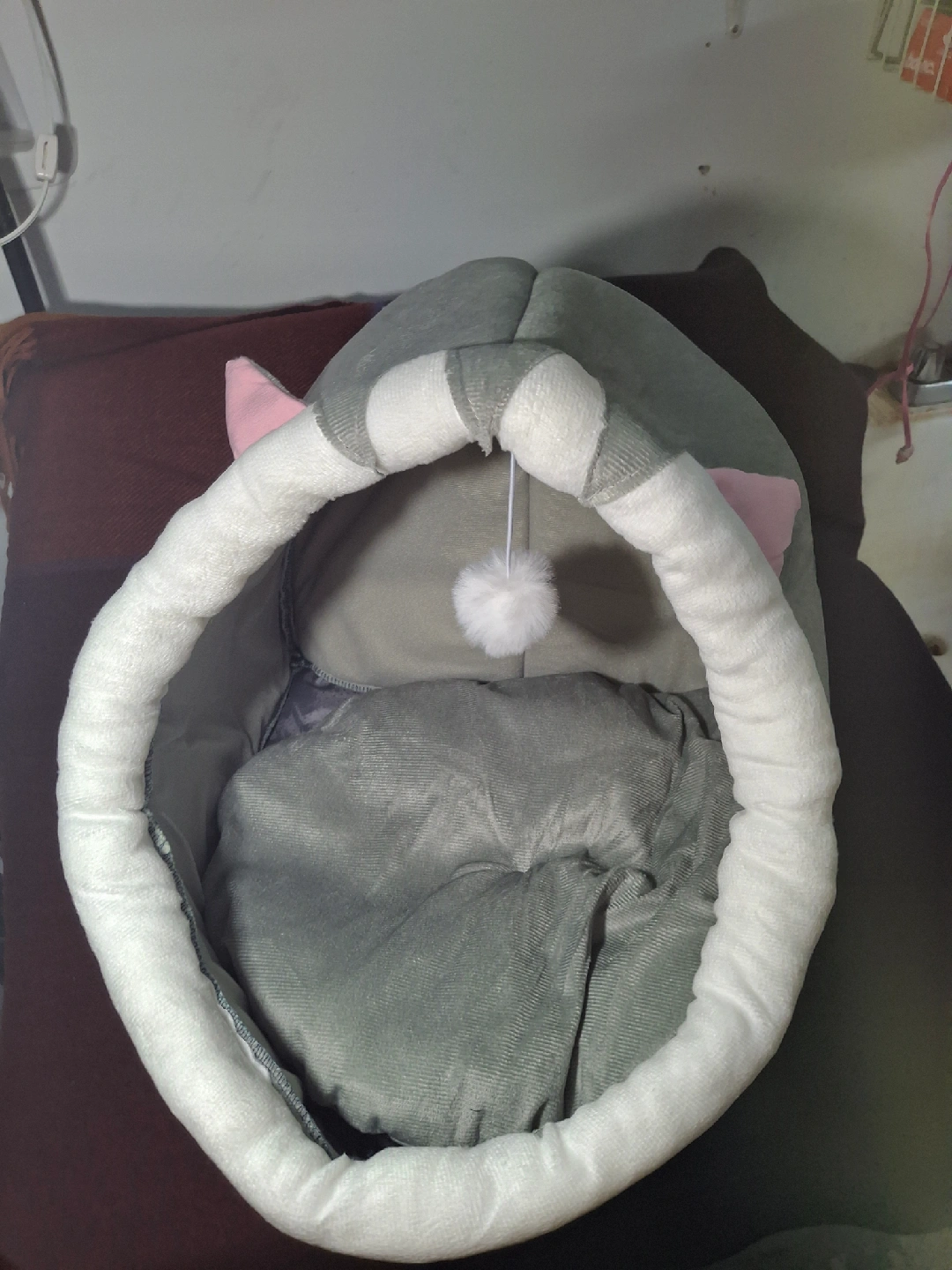 1000+Selling a cozy grey cat bed! It features a soft, plush interior and a playful pom-pom for your furry friend to enjoy. The bed is in great condition and ready for a new home. It has cute pink ears on top!