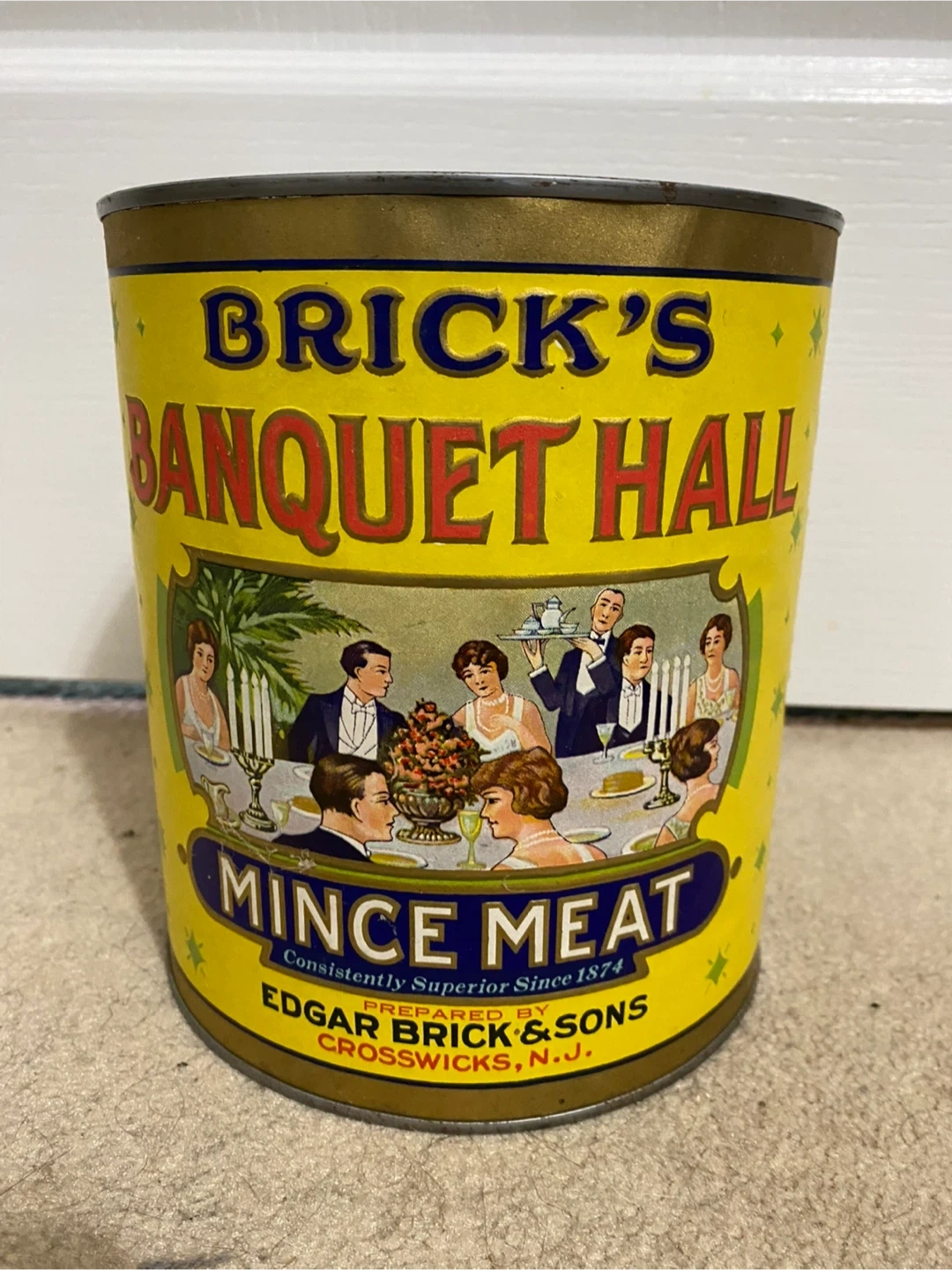 Selling a vintage 1920’s Brick's Banquet Hall tin. It's a yellow tin with a detailed graphic of a banquet hall scene. The tin is marked with 'Edgar Brick & Sons' and has a net weight of 7 lbs 8 oz. A neat piece for collectors!
