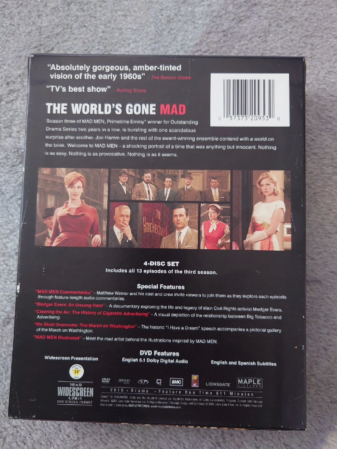 Selling the complete third season of Mad Men on DVD! This 4-disc set includes all 13 episodes. Enjoy the drama and intrigue of this award-winning series.